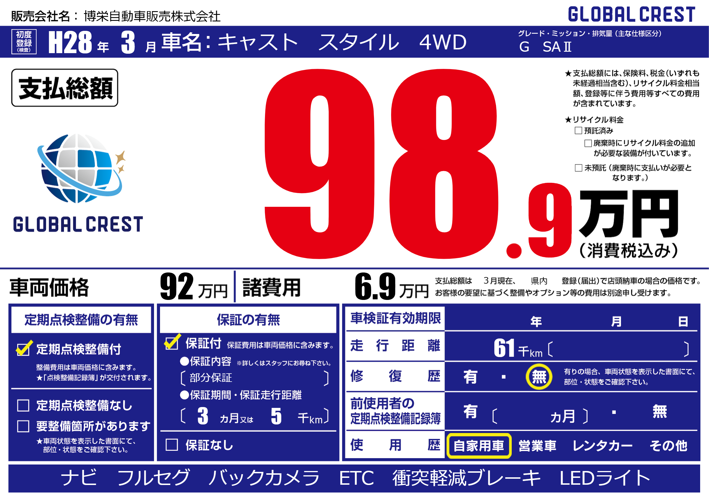 | 車名 | キャスト スタイル 4WD | グレード ミッション 排気量 |
