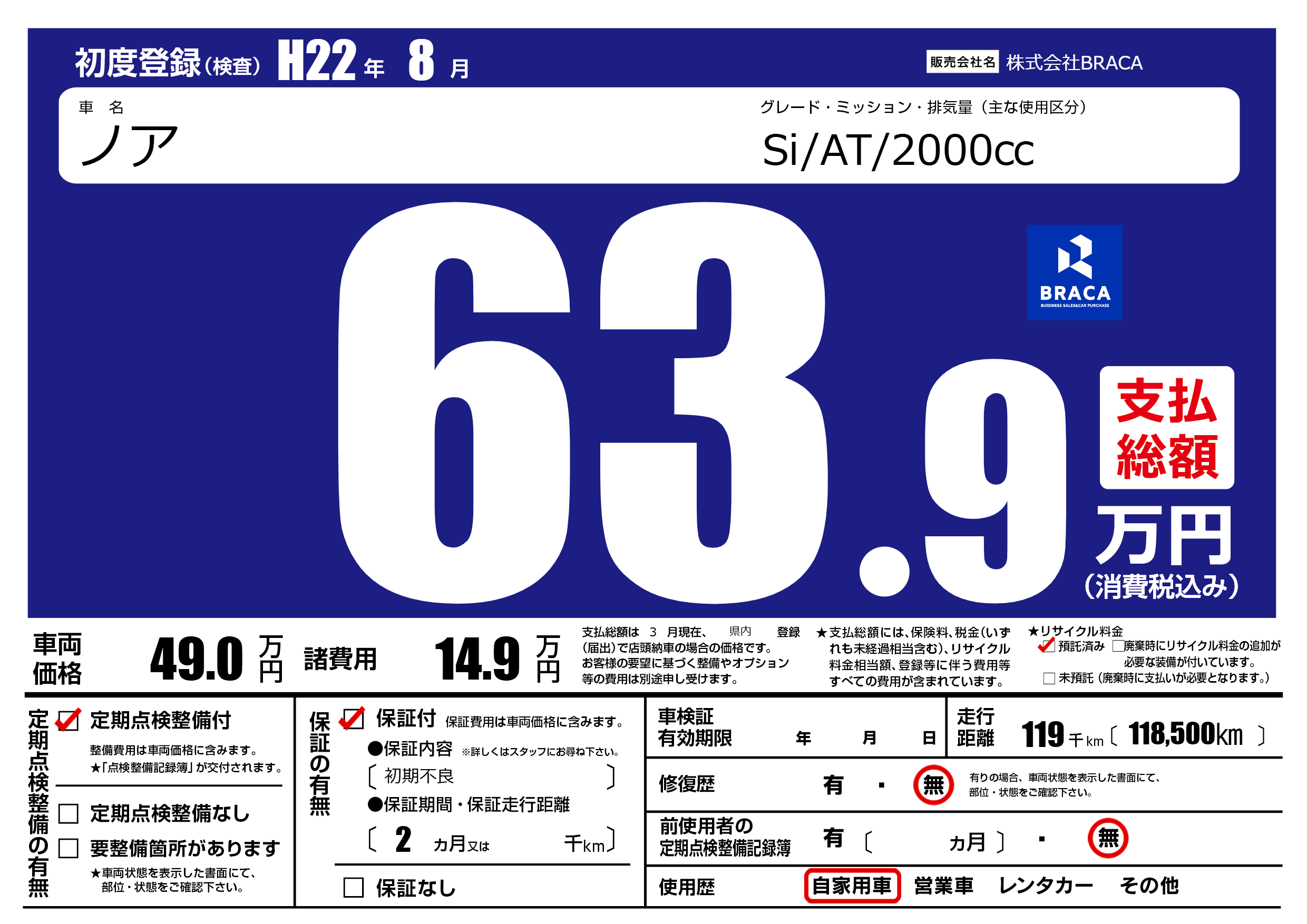 | 走行キロ | 11.9万km | 初年度登録 | H22年8月 |