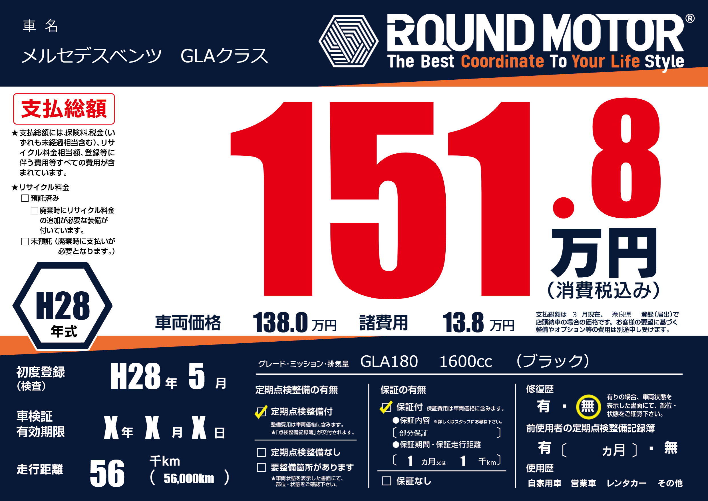 | 車名 | メルセデスベンツ GLAクラス | グレード ミッション 排気量 |