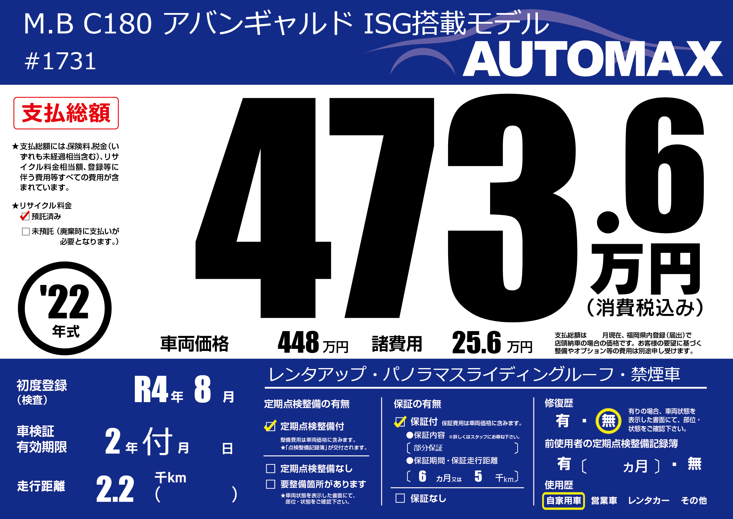 | 車名 | M.B C180 アバンギャルド ISG搭載モデル | グレード ミッション 排気量 |