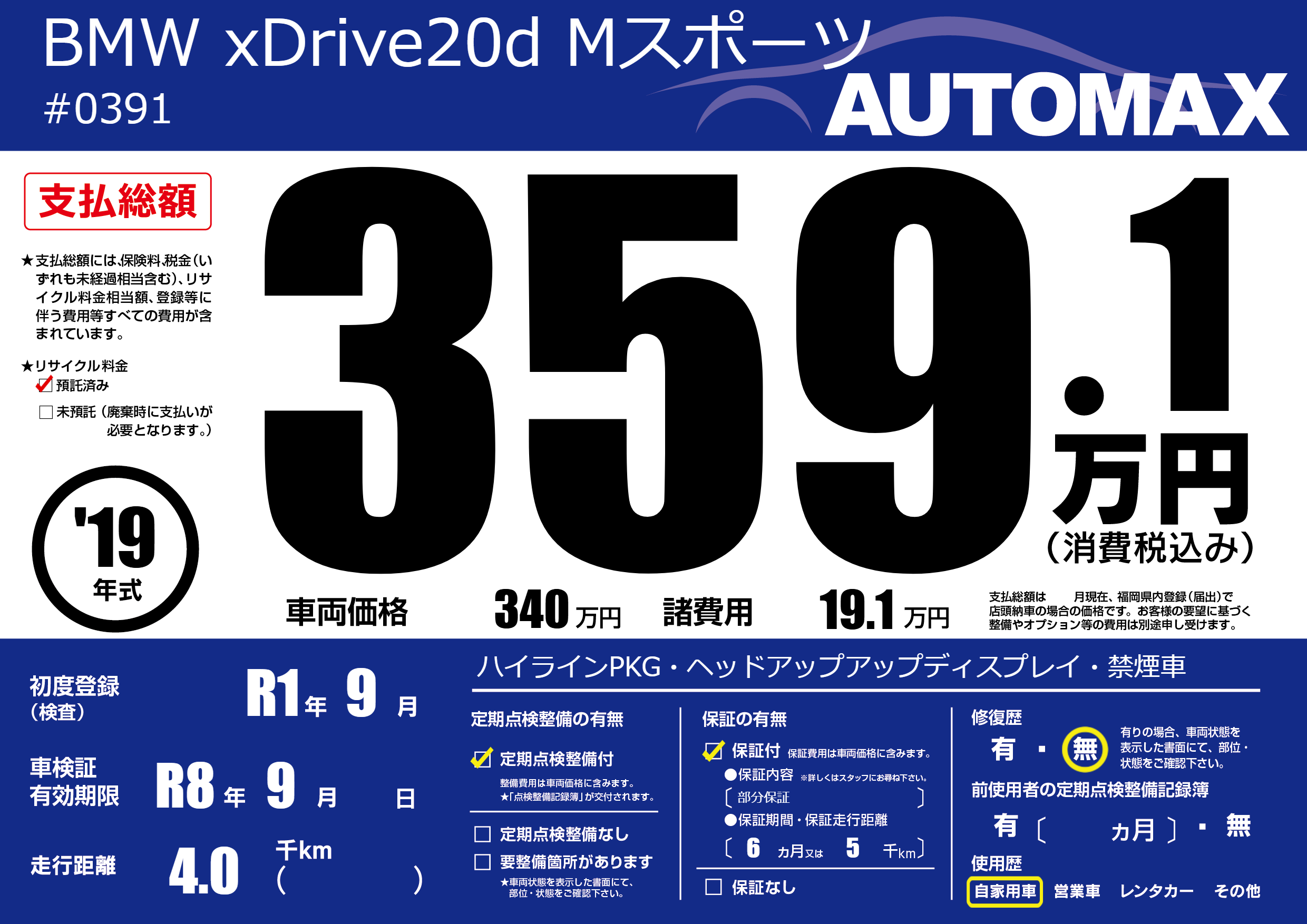 | 車名 | BMW xDrive20d Mスポーツ | グレード ミッション 排気量 |