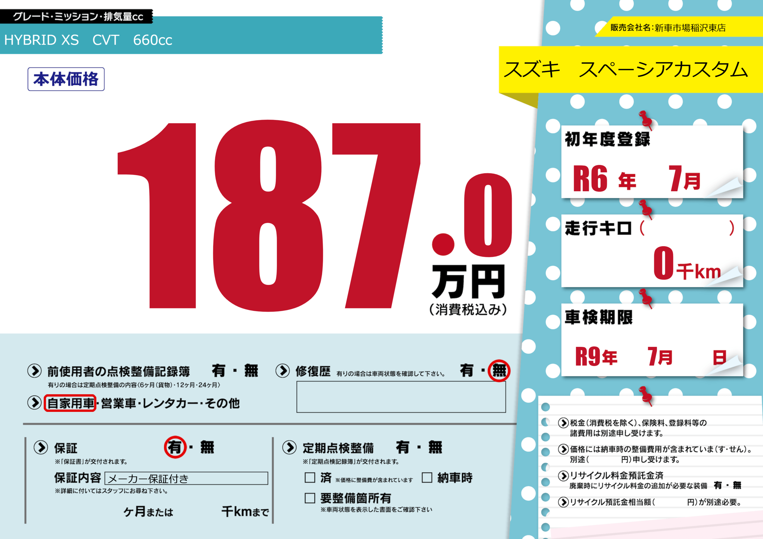 | 車名 | スズキ スペーシアカスタム | グレード ミッション 排気量 |