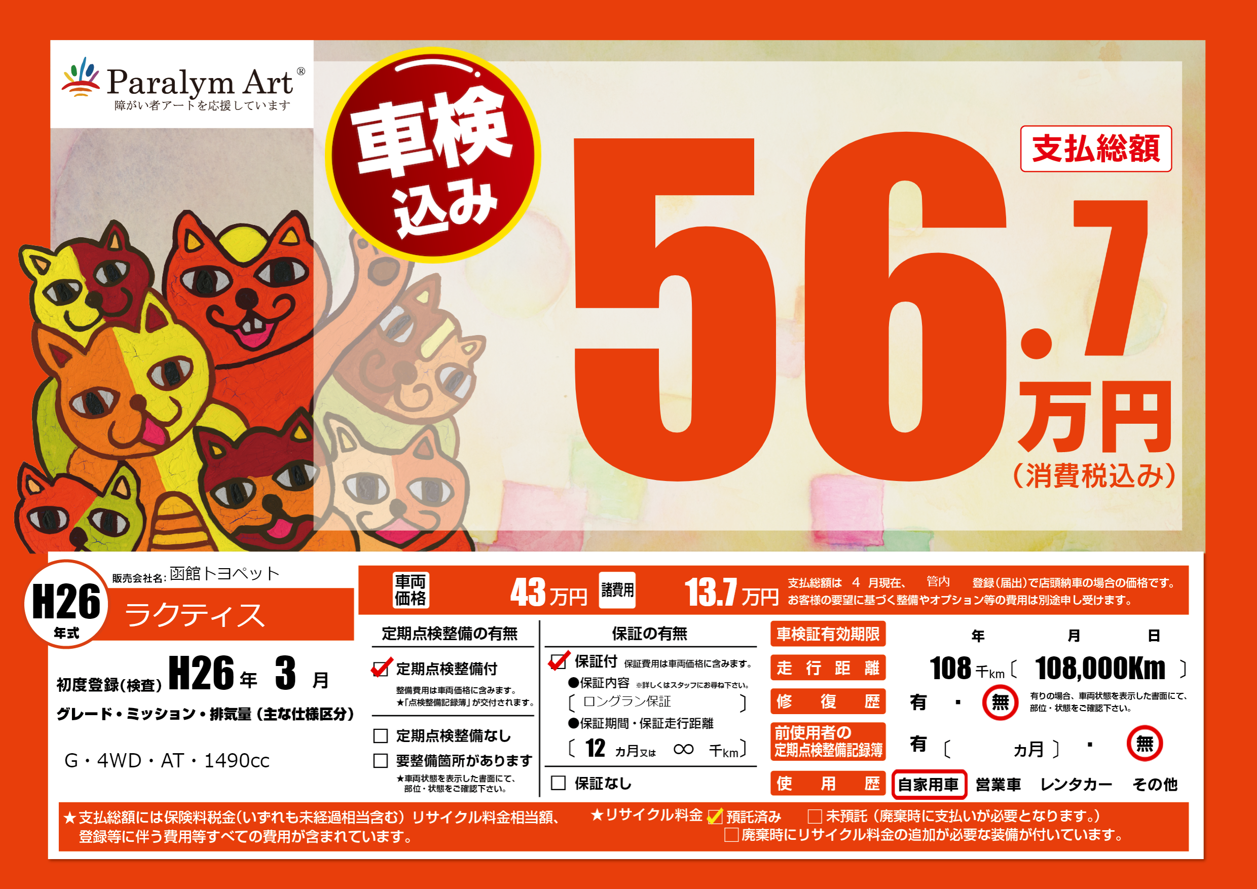 | 車名 | ラクティス | グレード ミッション 排気量 |