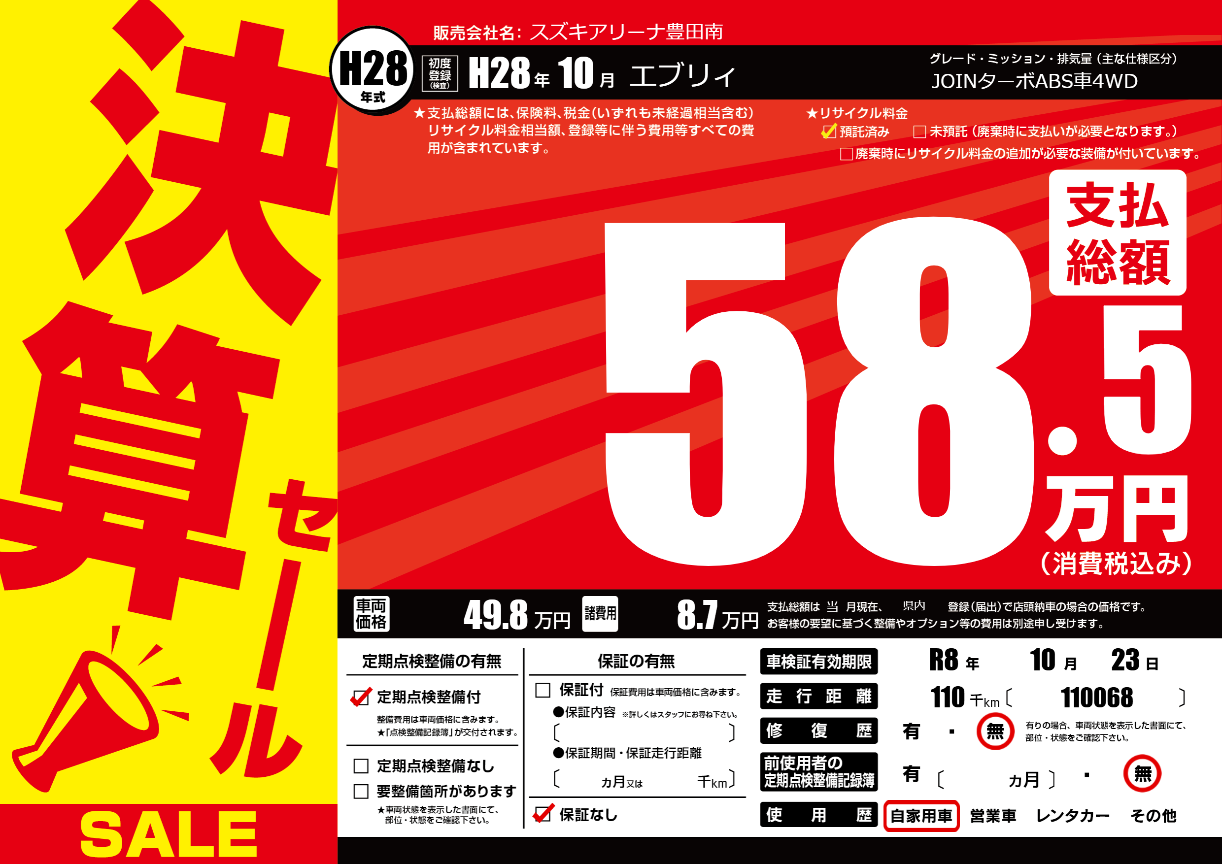 | 車名 | エブリィ | グレード ミッション 排気量 |