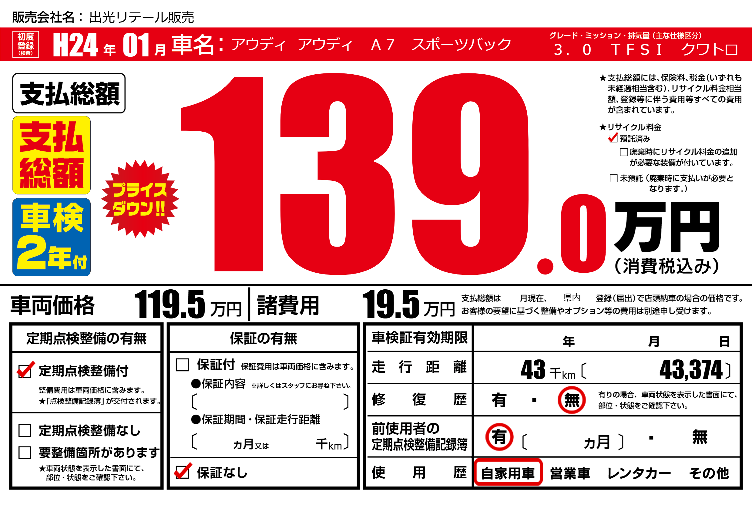 あり | リサイクル預託金相当額 | ( 0円)が別途必要 |