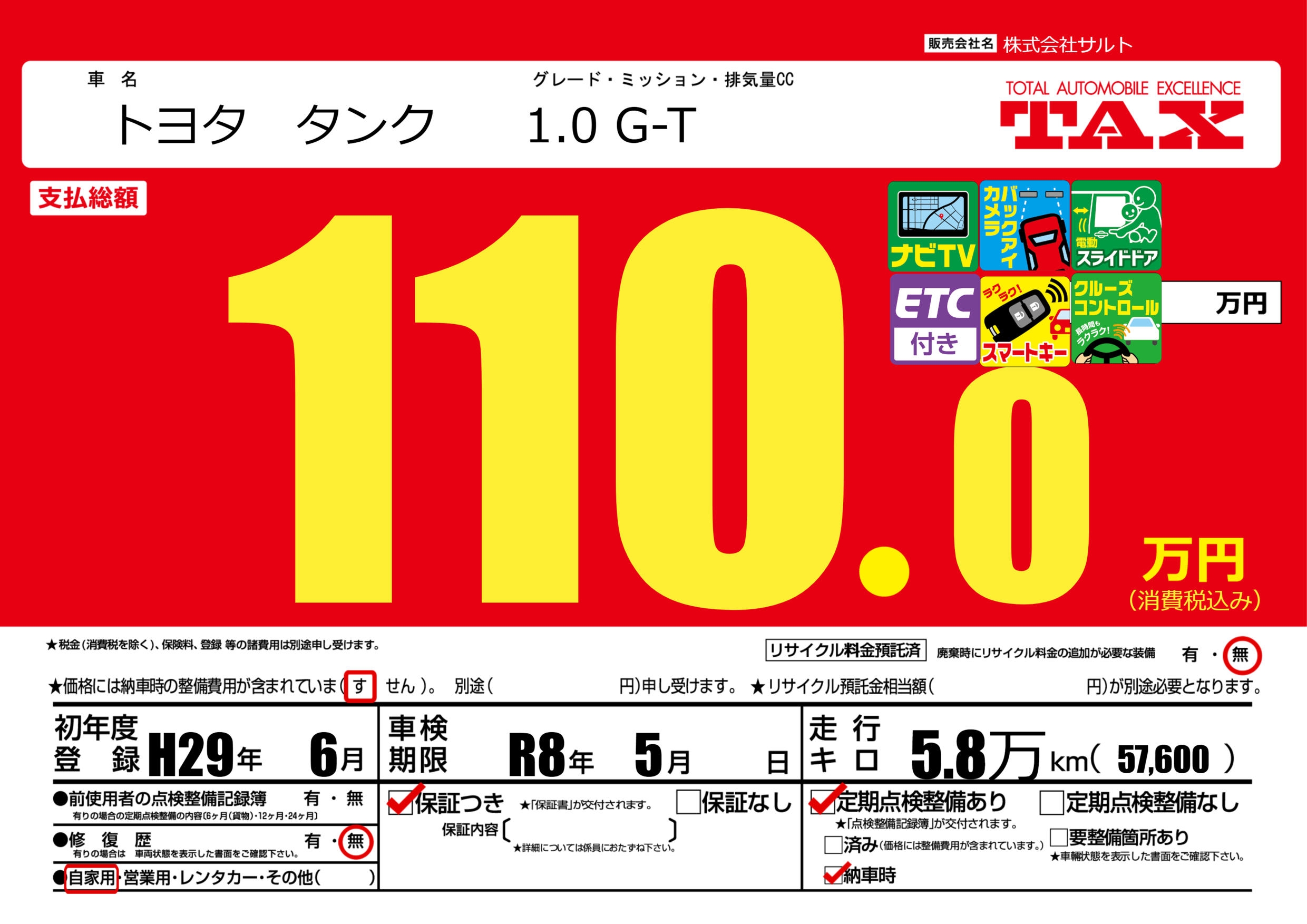 | 車名 | トヨタ タンク | グレード ミッション 排気量 |