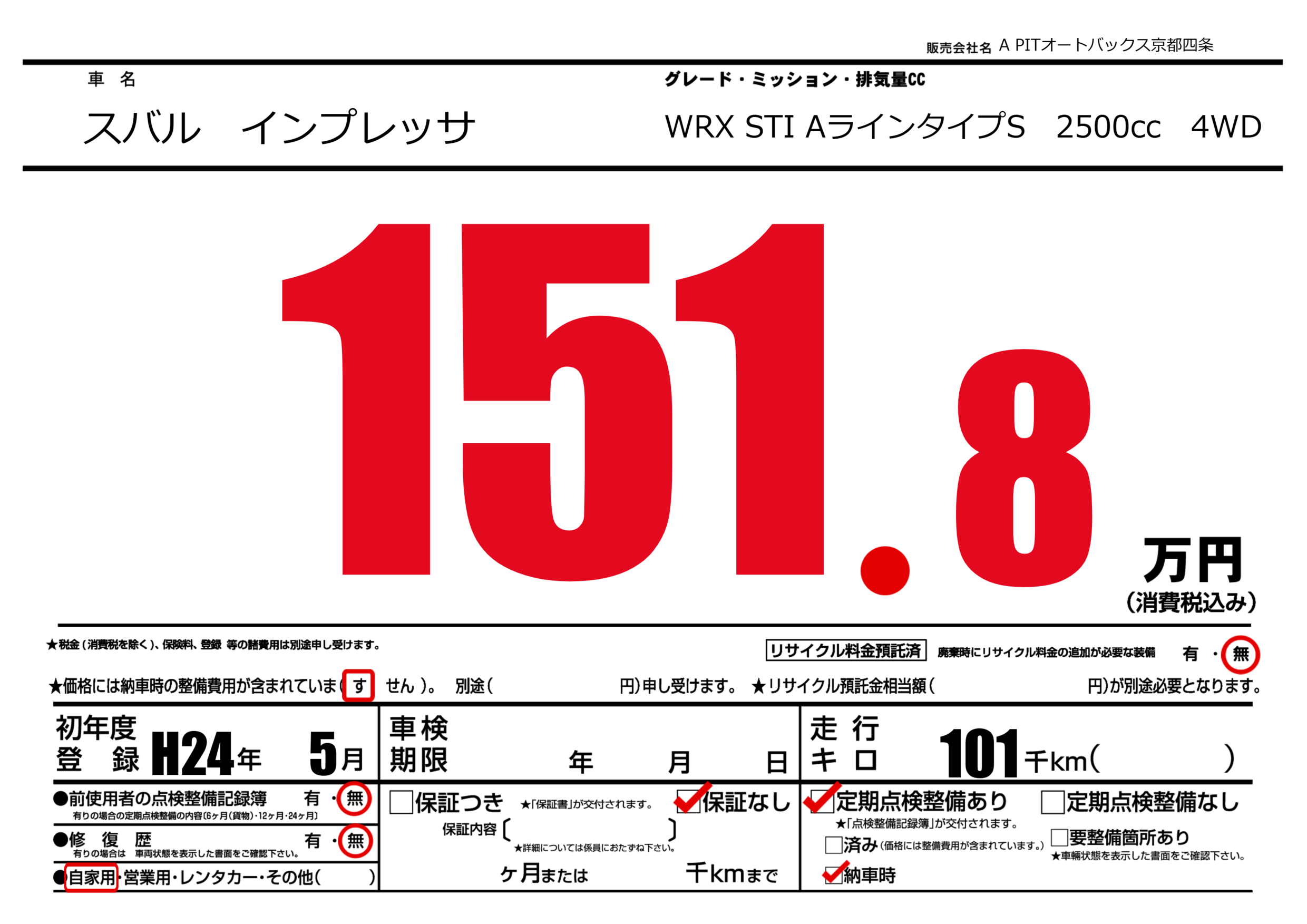 | 車名 | スバル インプレッサ | グレード ミッション 排気量 |