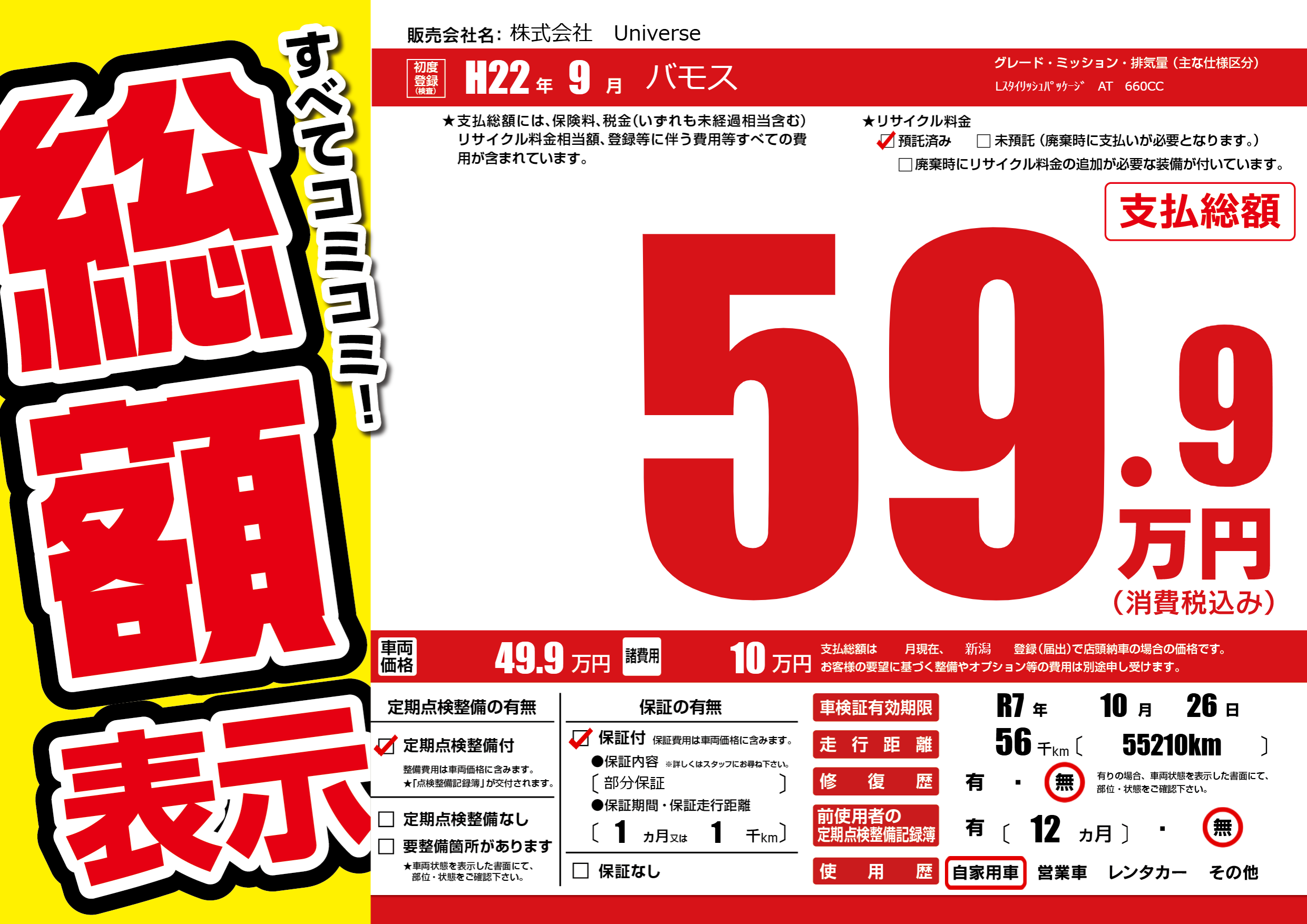 | 走行キロ | 5.6万km | 初年度登録 | H22年9月 |