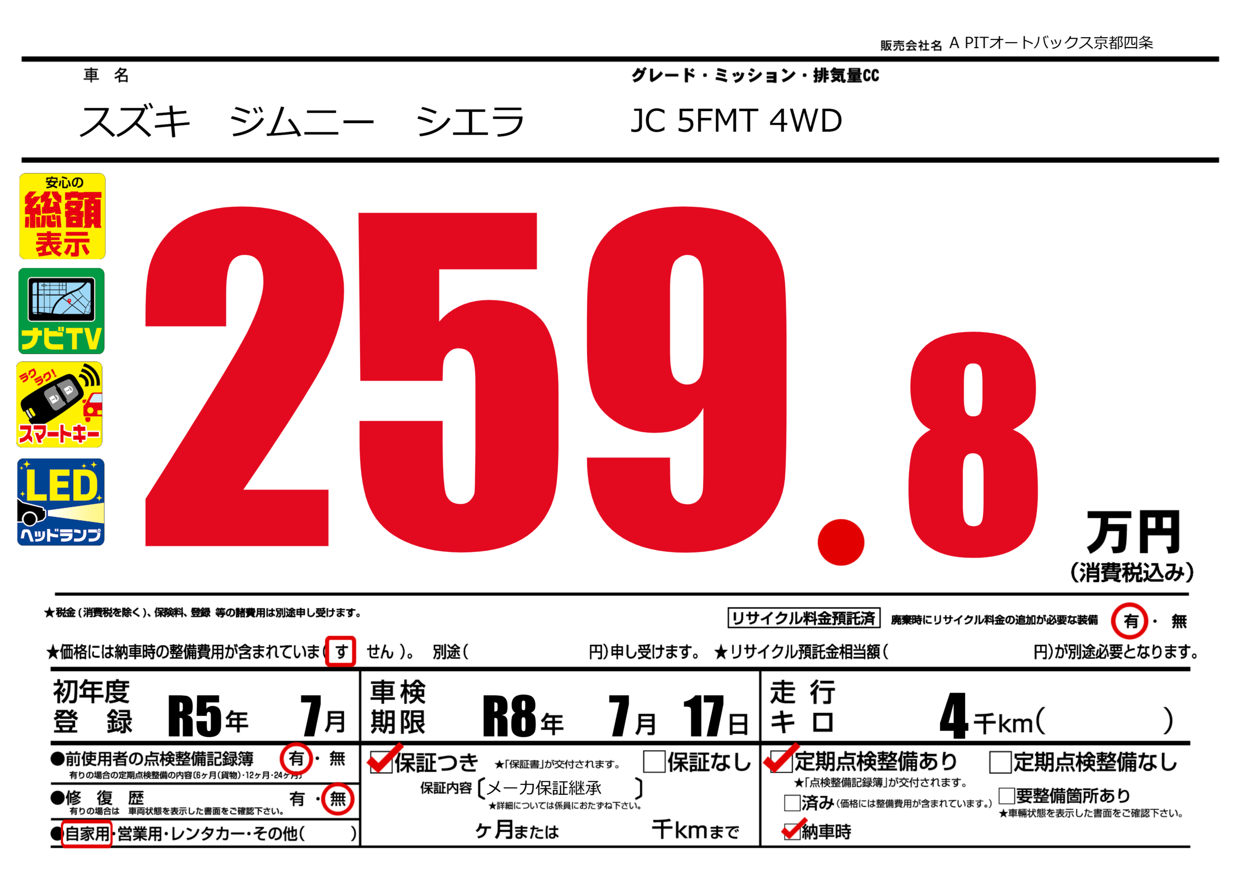| 車名 | スズキ ジムニー シエラ | グレード ミッション 排気量 |