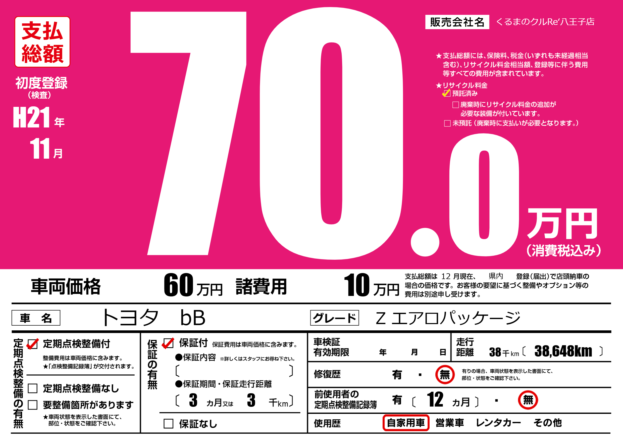 | 車名 | トヨタ bB | グレード ミッション 排気量 |