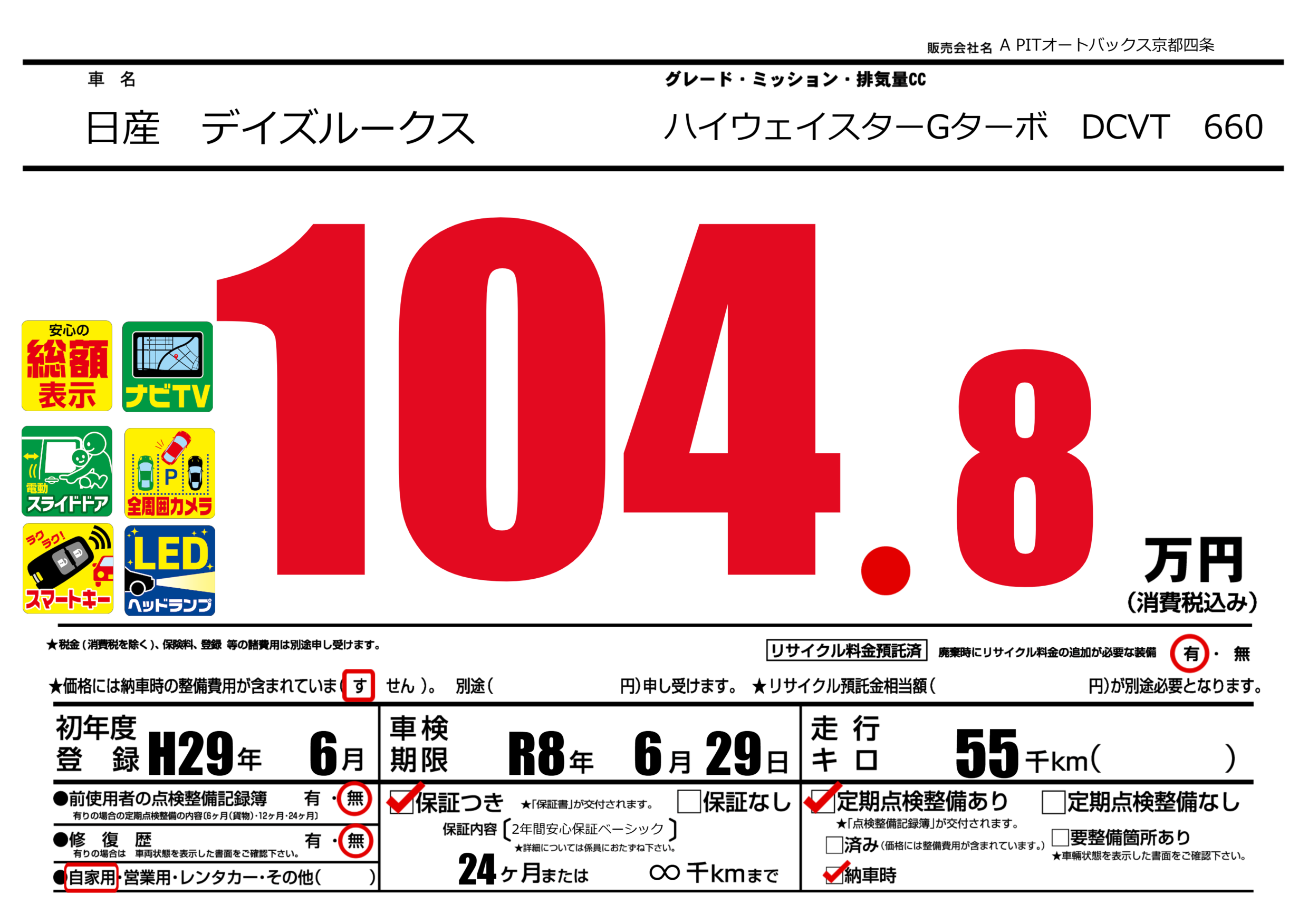 | 車名 | 日産 デイズルークス | グレード ミッション 排気量 |