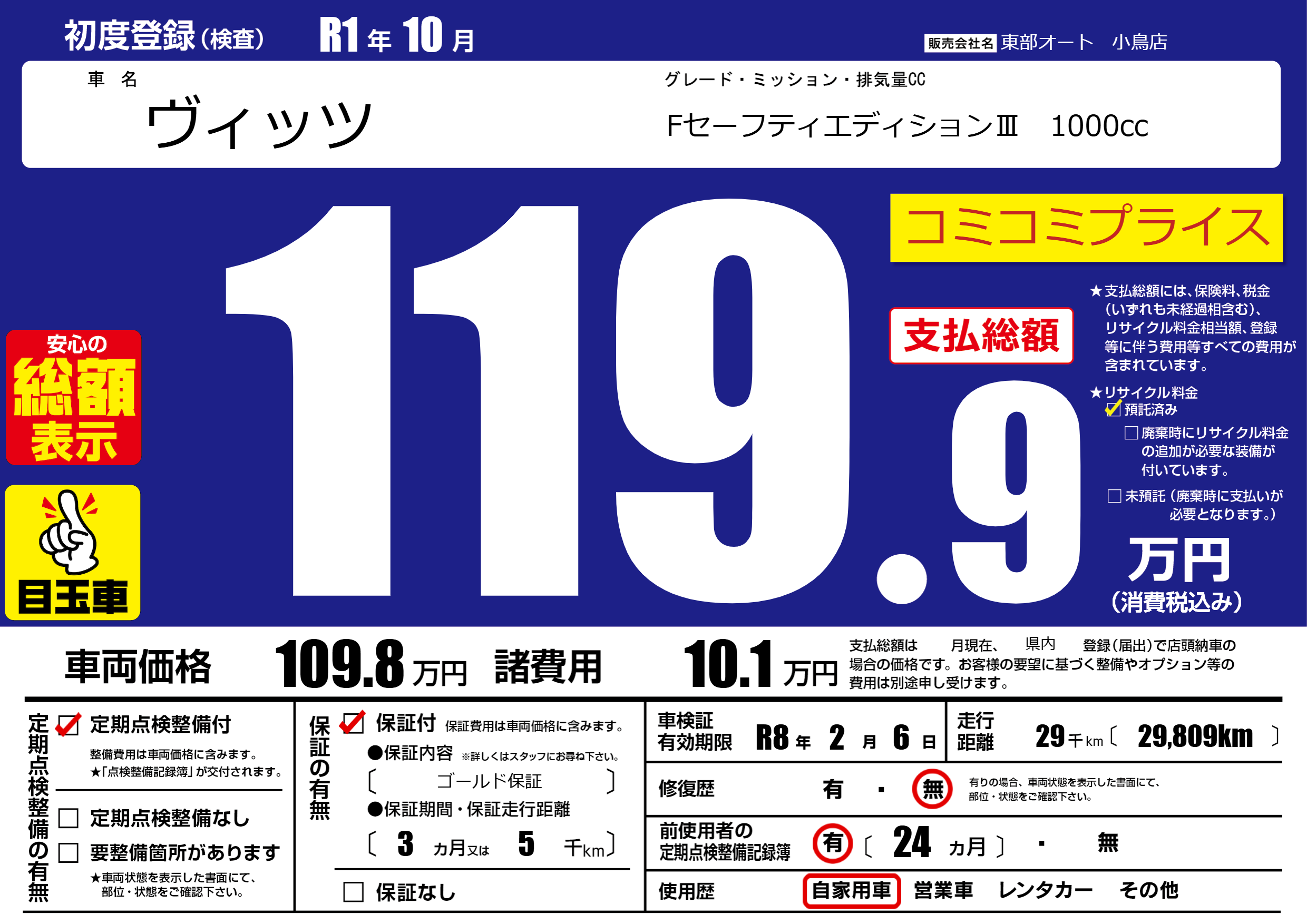 | 車名 | ヴィッツ | グレード ミッション 排気量 |