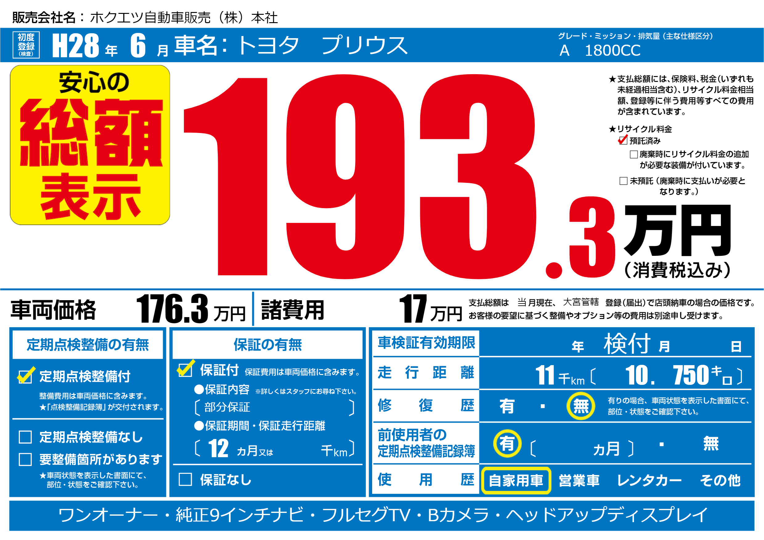 | 車名 | トヨタ プリウス | グレード ミッション 排気量 |