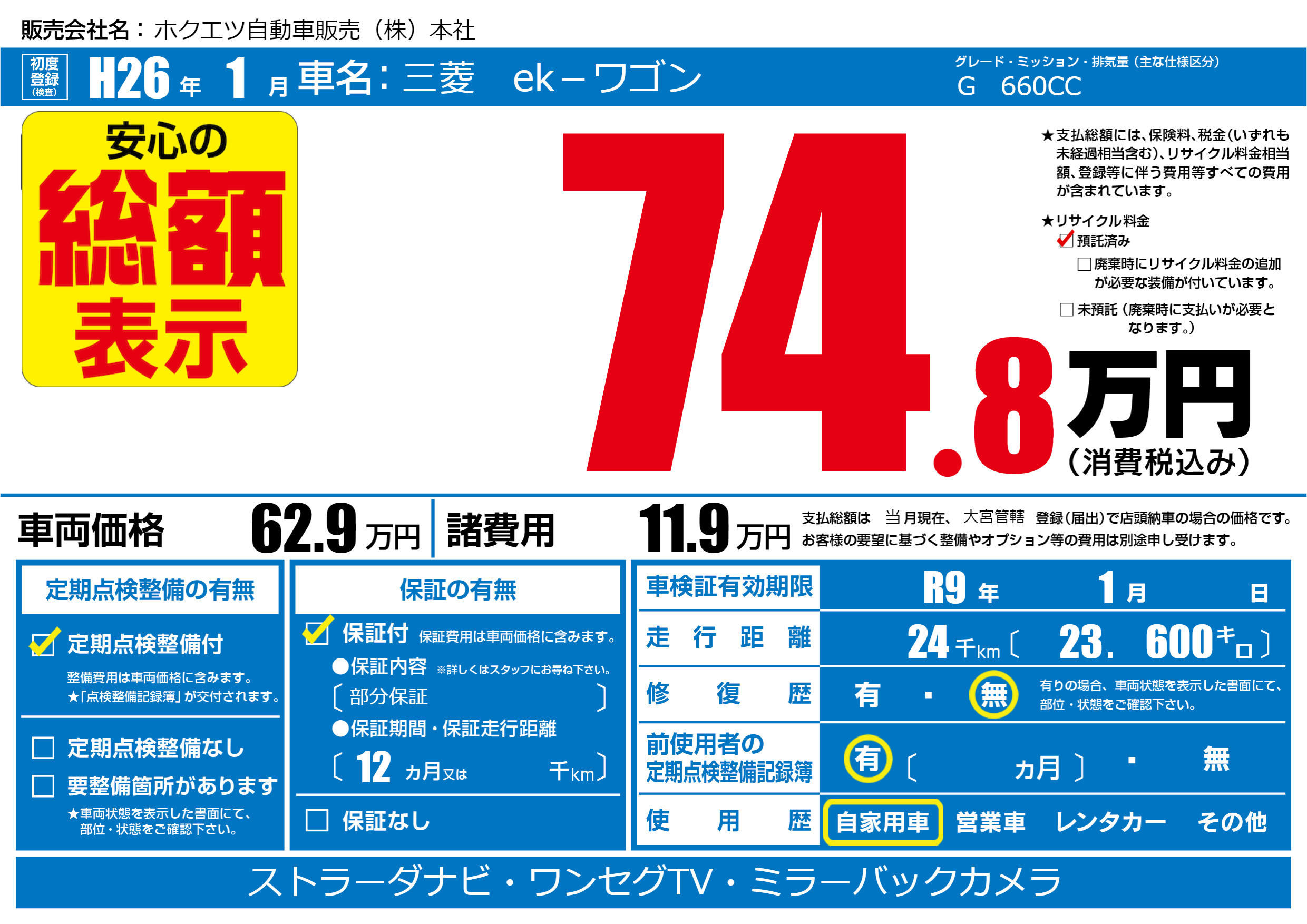 | 車名 | 三菱 ek-ワゴン | グレード ミッション 排気量 |