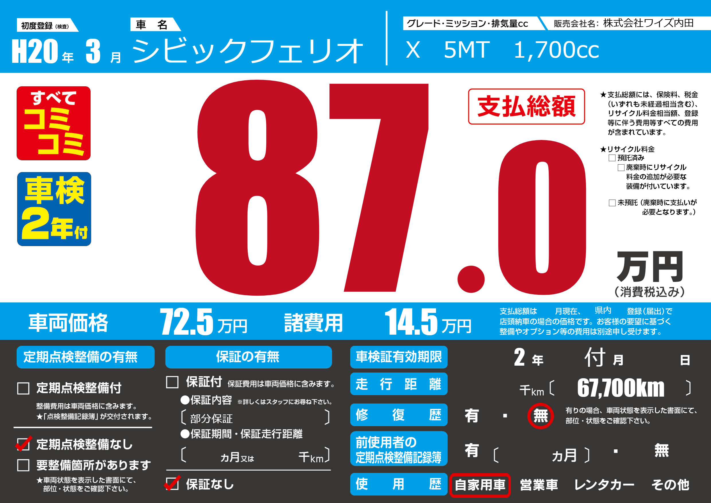 | 車名 | シビックフェリオ | グレード ミッション 排気量 |