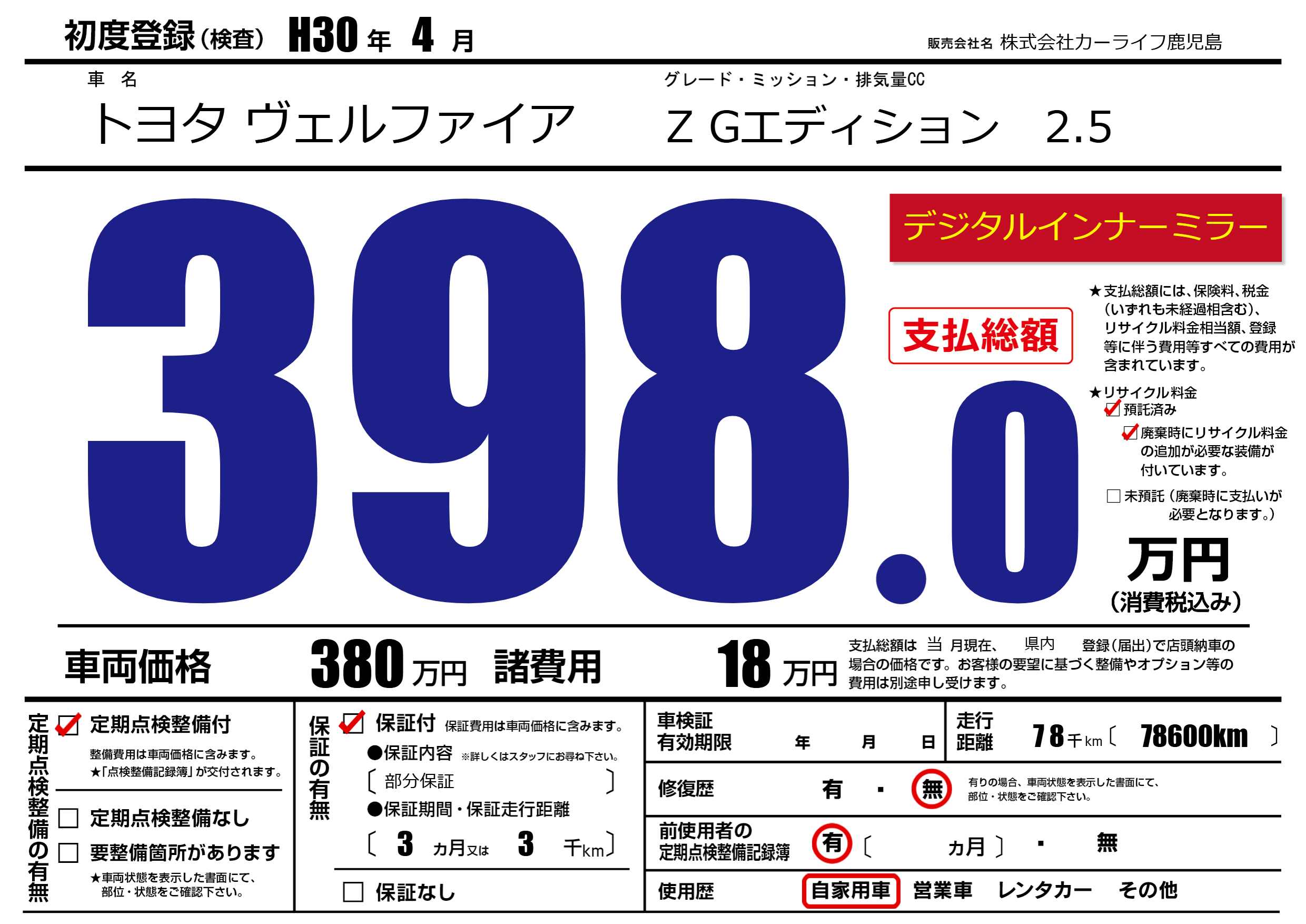 | 車名 | トヨタ ヴェルファイア | グレード ミッション 排気量 |
