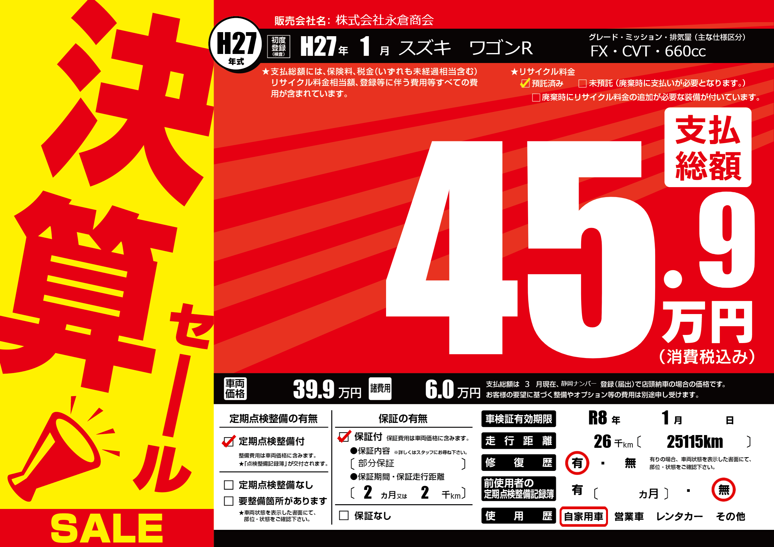 | 車検制限 | R8年 1月 - 日 | ||