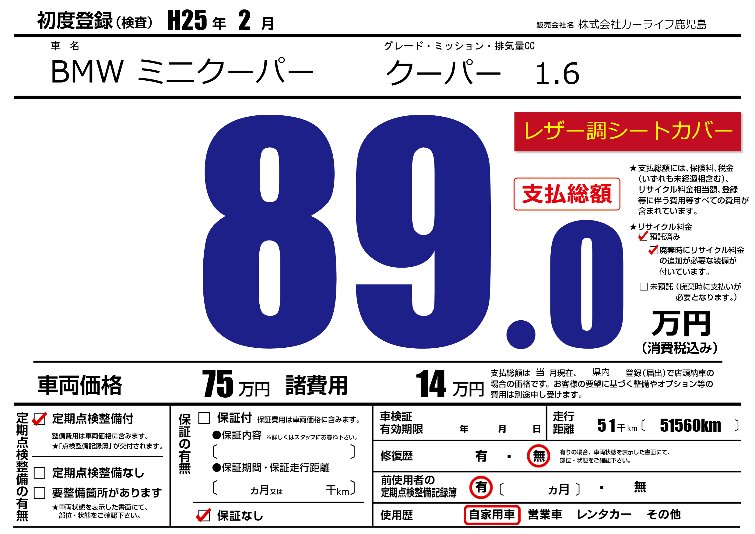 | 車名 | BMW ミニクーパー | グレード ミッション 排気量 |
