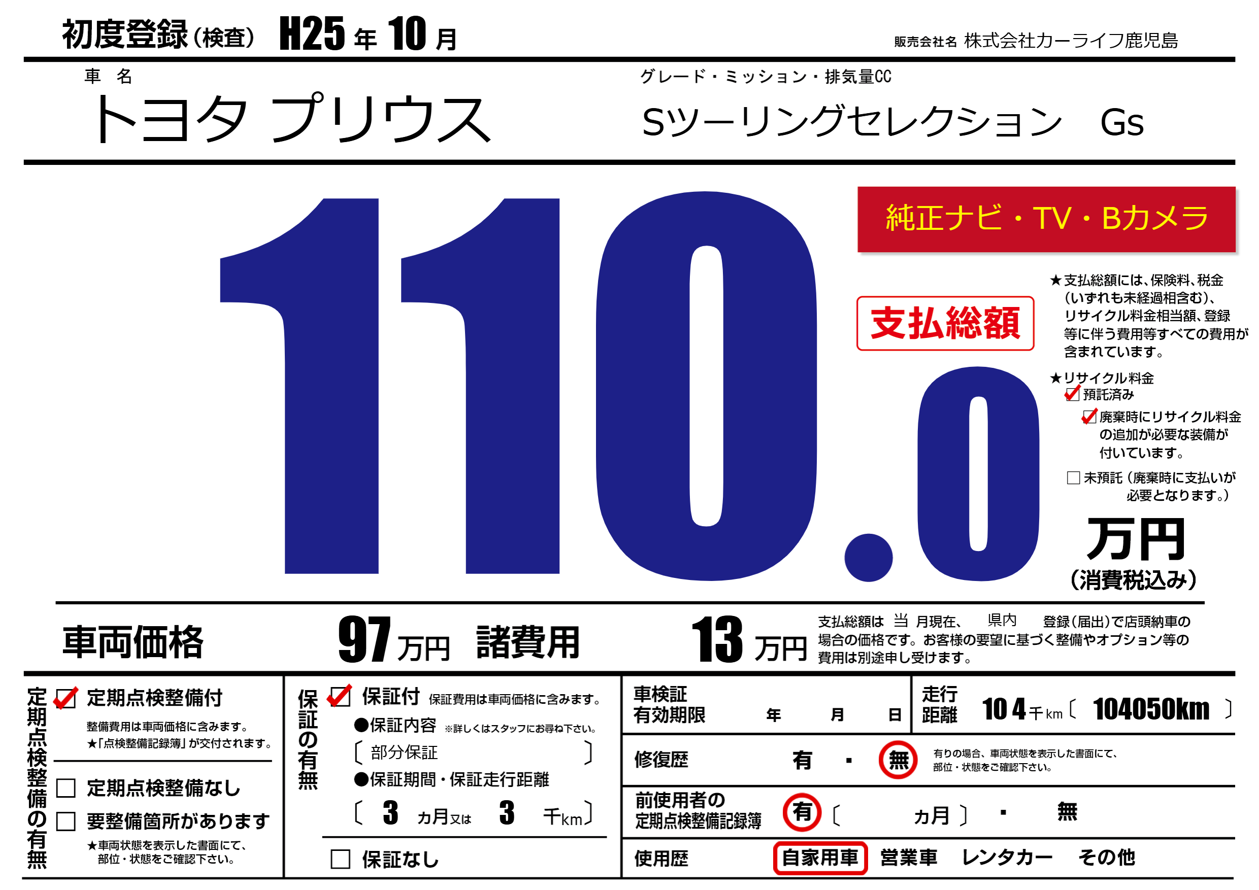| 車名 | トヨタ プリウス | グレード ミッション 排気量 |