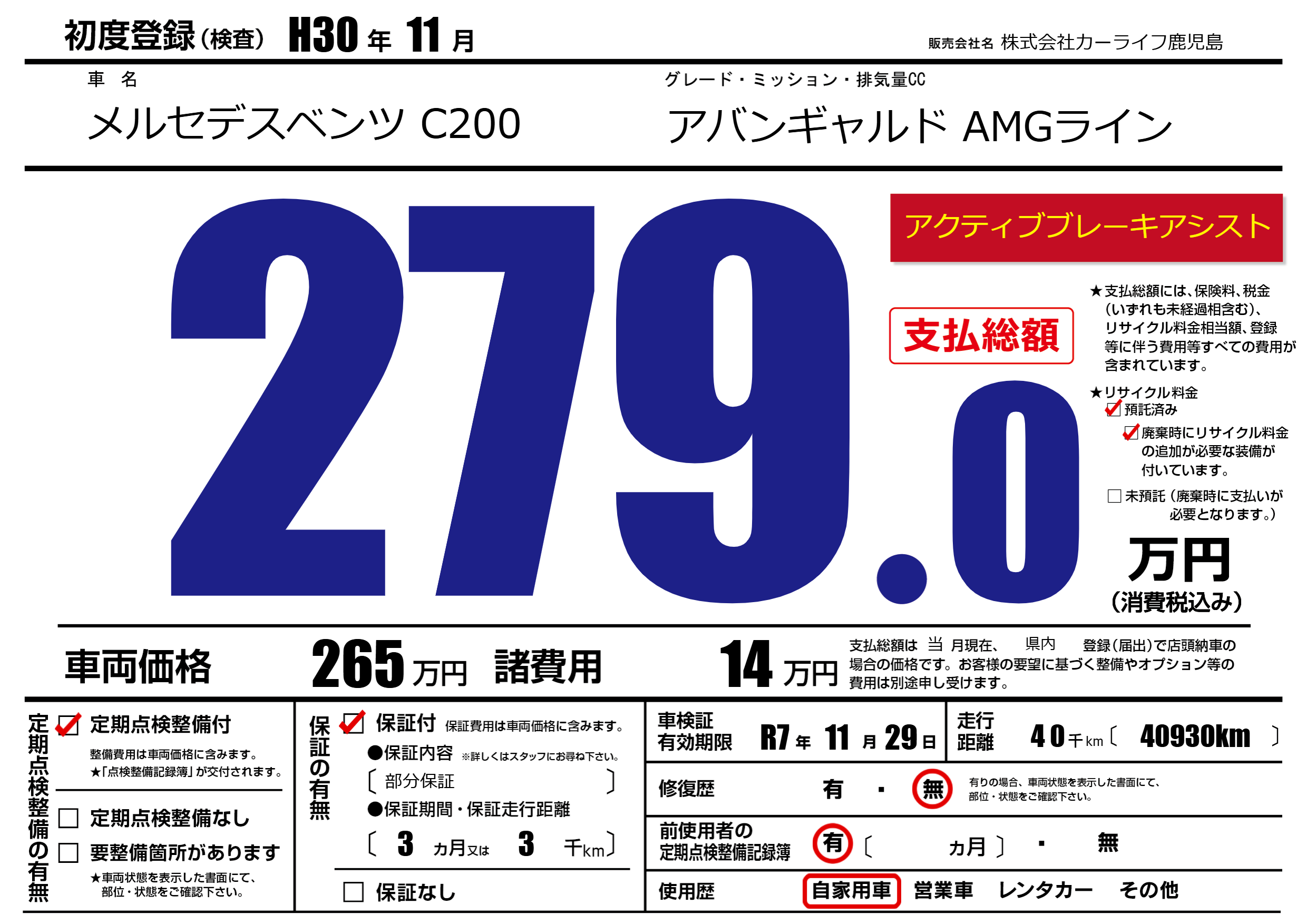 | 車名 | メルセデスベンツ C200 | グレード ミッション 排気量 |