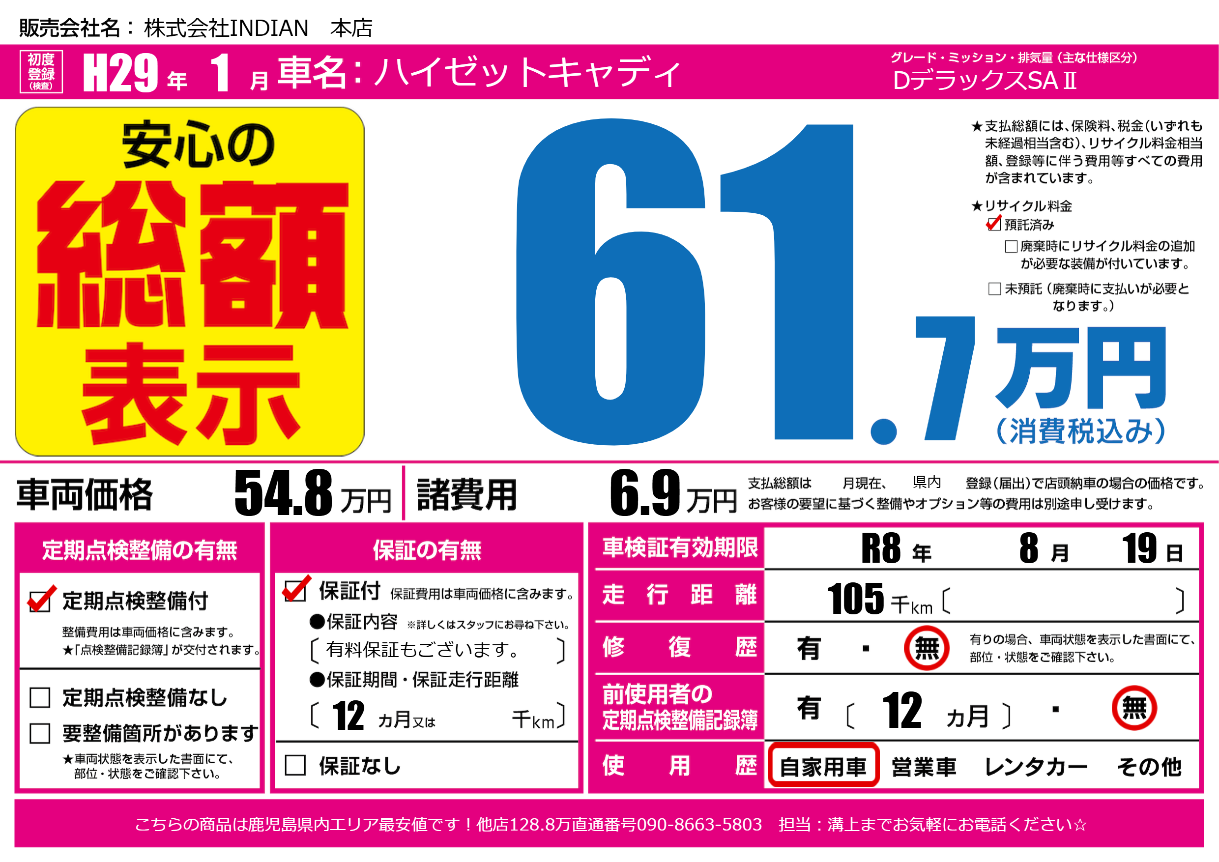 | 走行キロ | 10.5万km | 初年度登録 | H29年1月 |