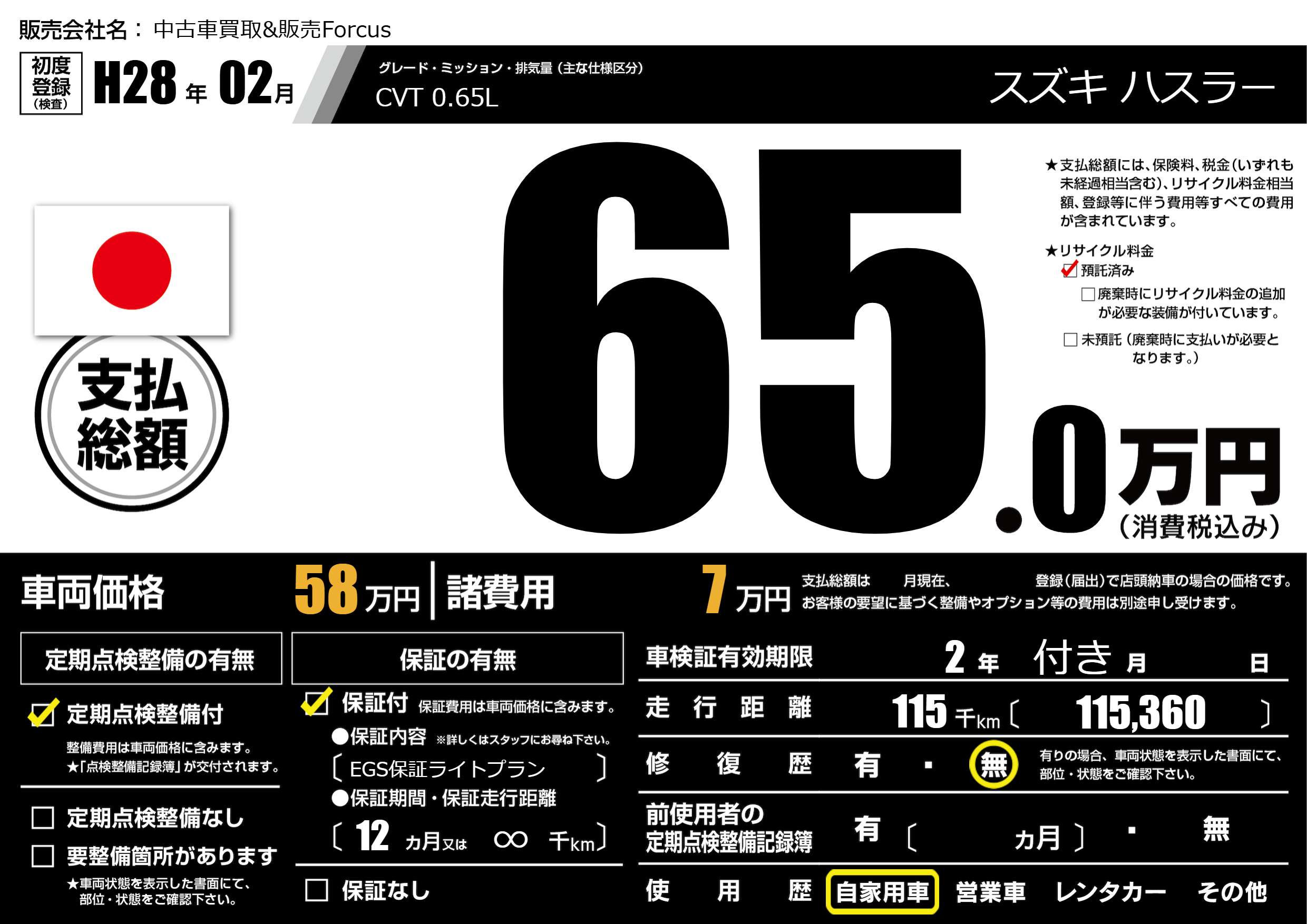 | 車名 | スズキ ハスラー | グレード ミッション 排気量 |