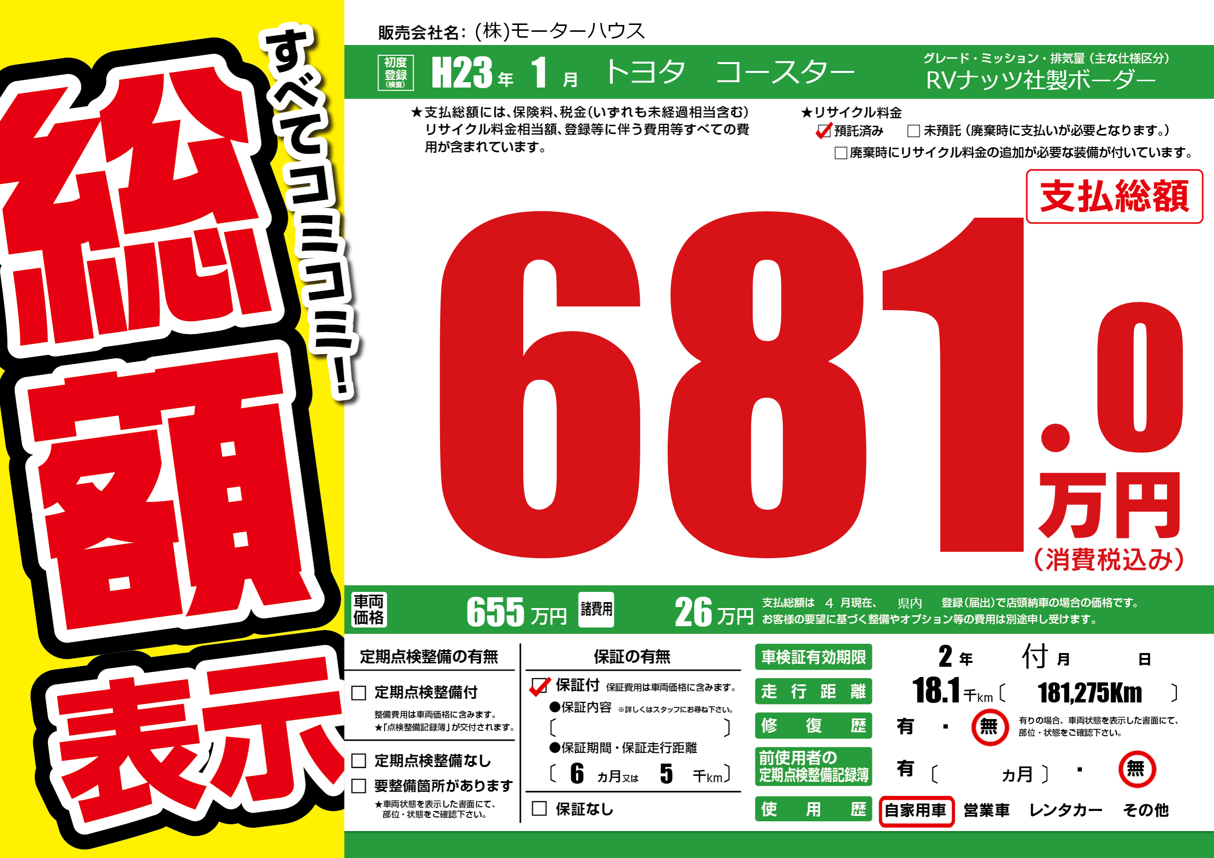 | 車名 | トヨタ コースター | グレード ミッション 排気量 |