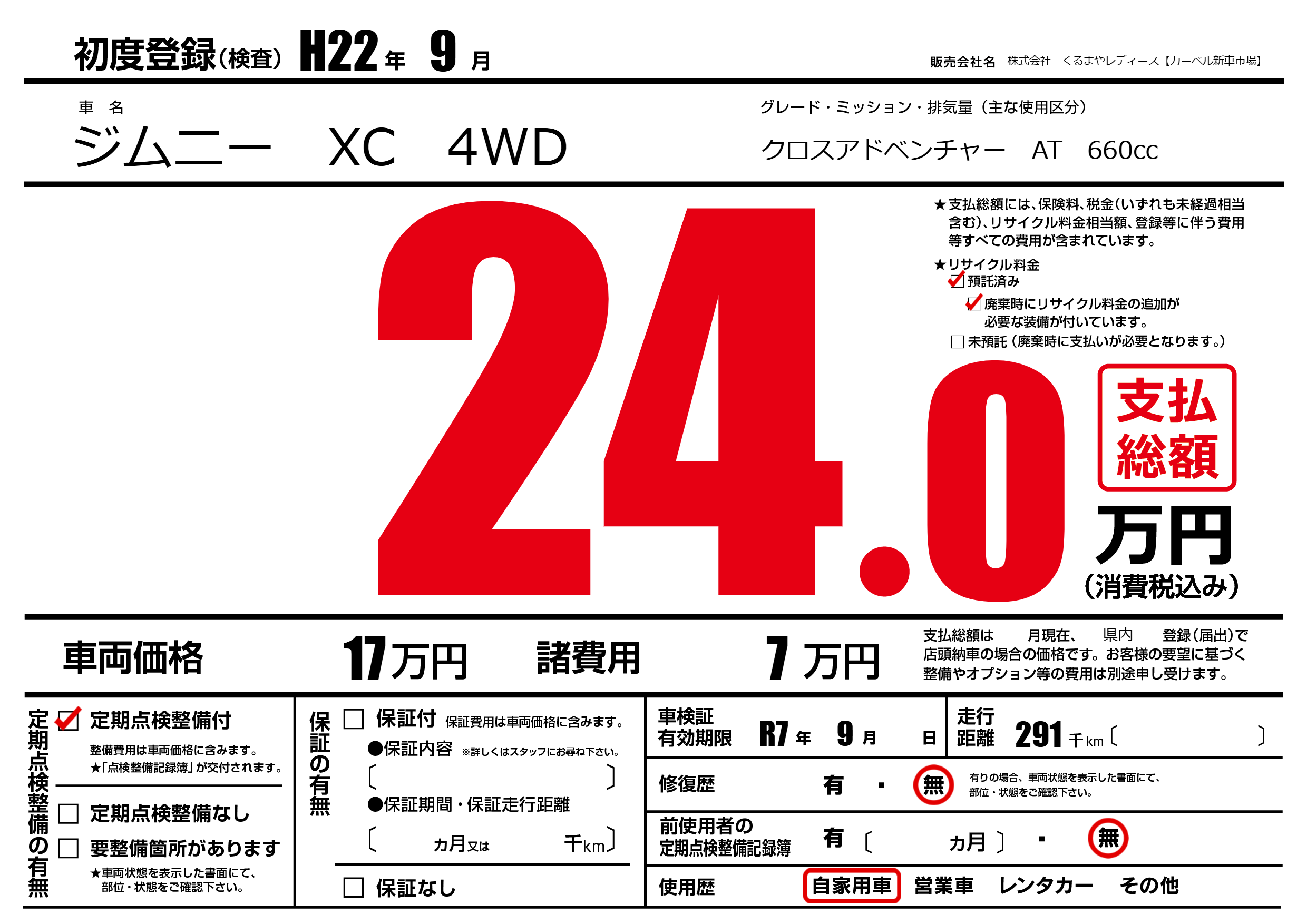 | 走行キロ | 29.1万km | 初年度登録 | H22年9月 |