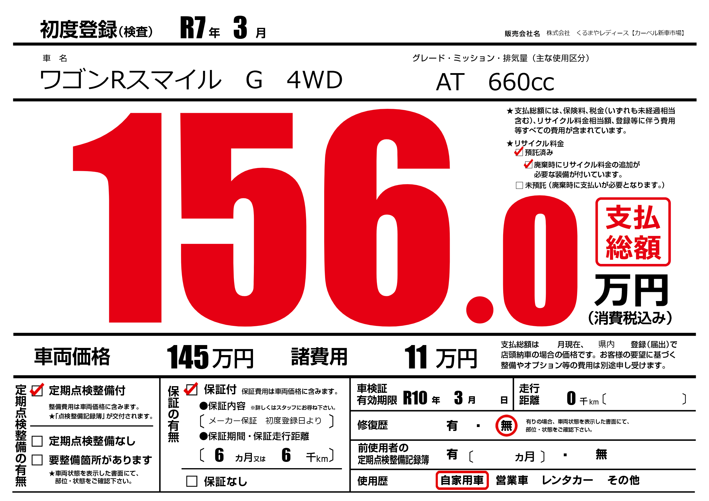 | 車名 | ワゴンRスマイル G 4WD | グレード ミッション 排気量 |