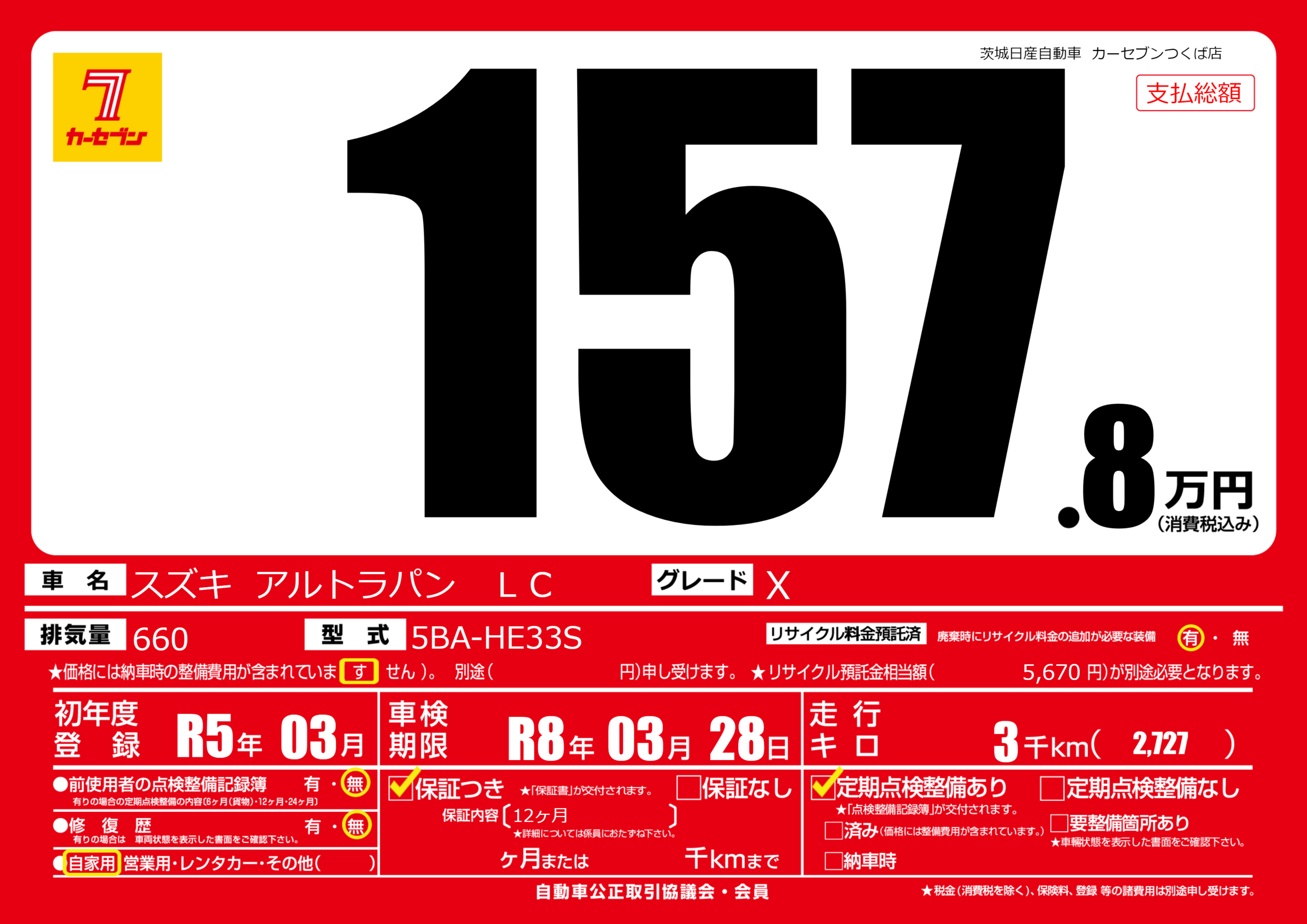 | 走行キロ | 0.3万km | 初年度登録 | R5年03月 |