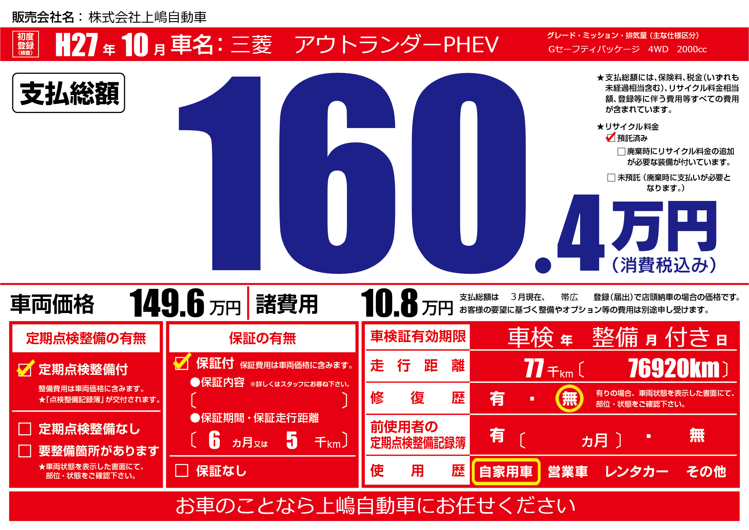 | 車名 | 三菱 アウトランダーPHEV | グレード ミッション 排気量 |