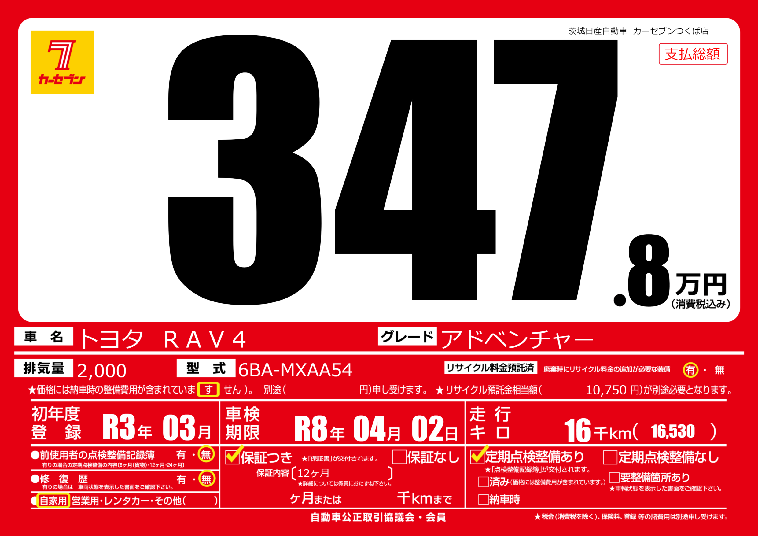 | 車名 | トヨタ RAV4 | グレード ミッション 排気量 |