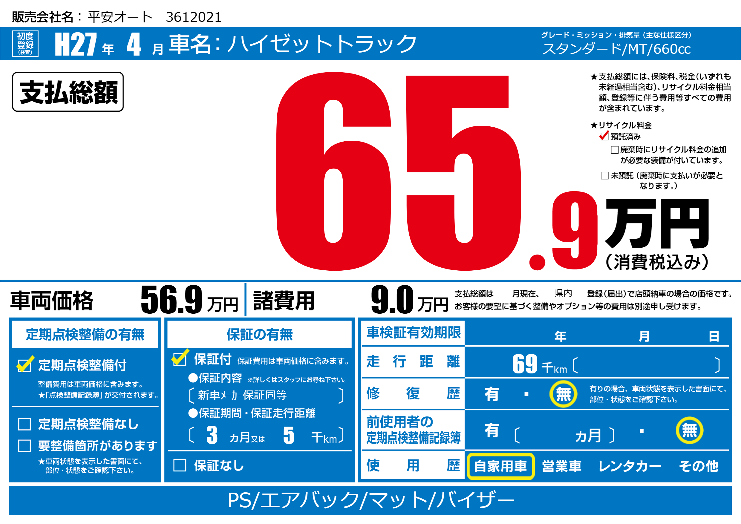 | 車名 | ハイゼットトラック | グレード ミッション 排気量 |