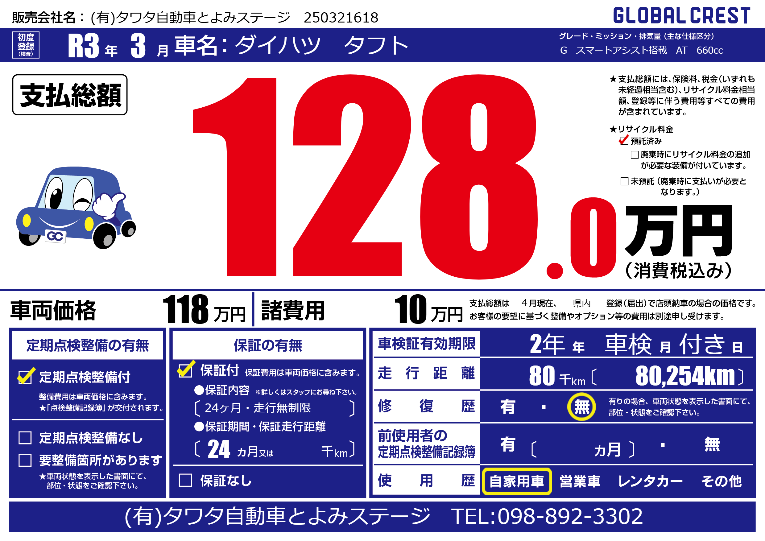 | 走行キロ | 8万km | 初年度登録 | R3年3月 |