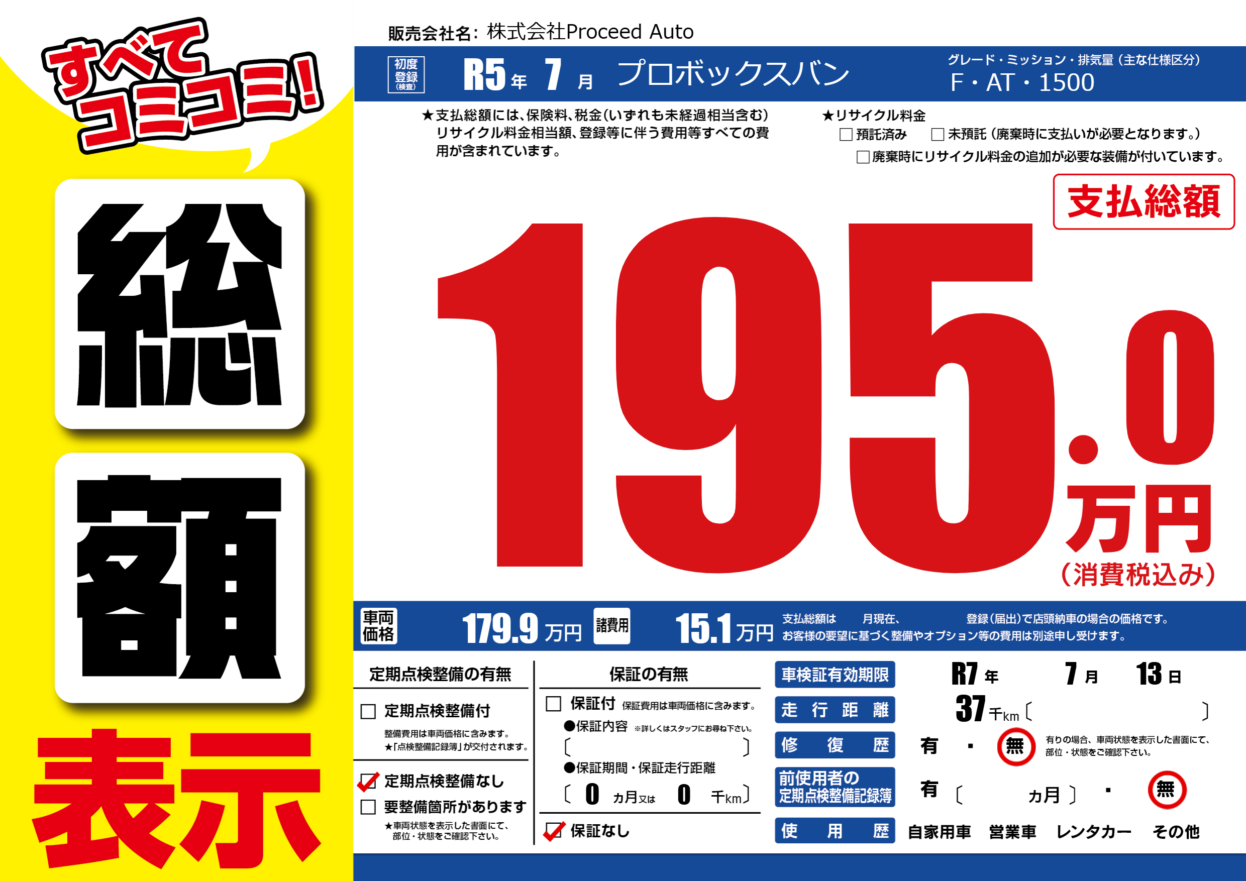 | 車名 | プロボックスバン | グレード ミッション 排気量 |