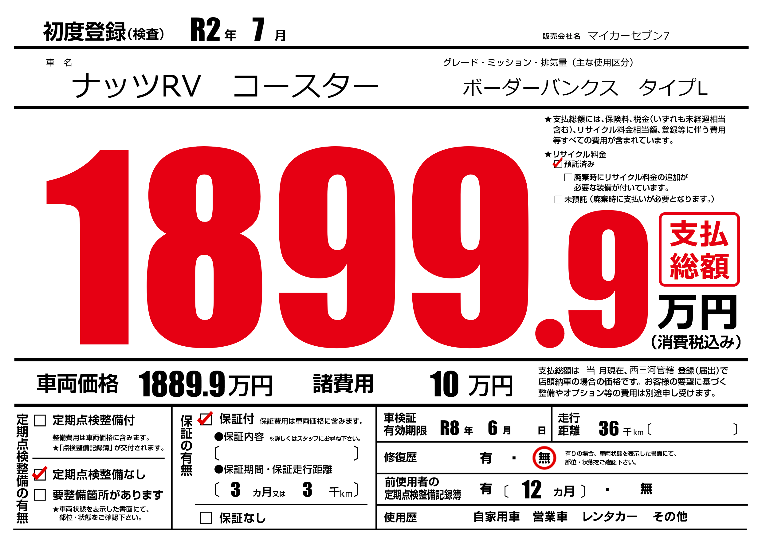 | 車名 | ナッツRV コースター | グレード ミッション 排気量 |