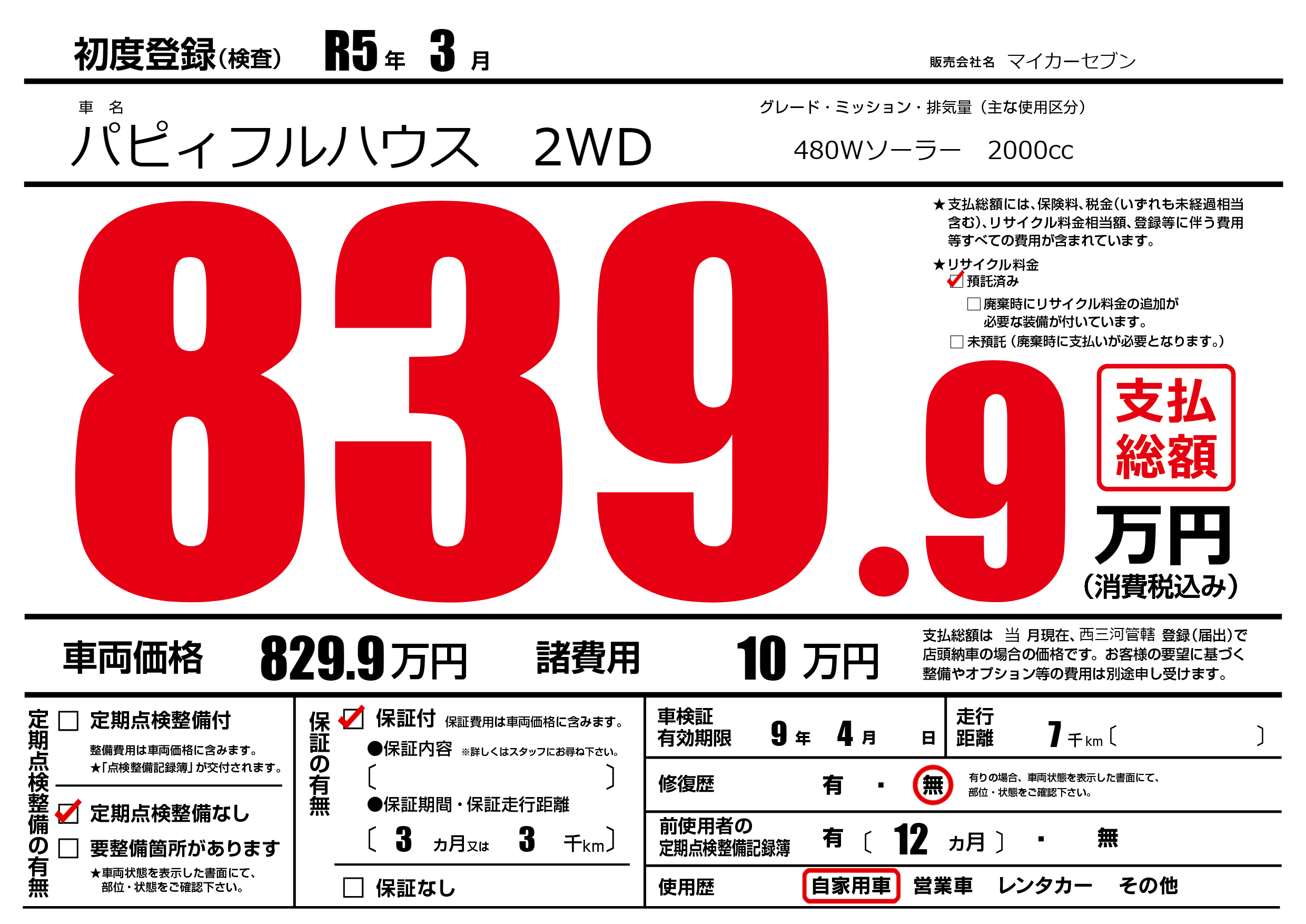 | 走行キロ | 0.7万km | 初年度登録 | R5年3月 |