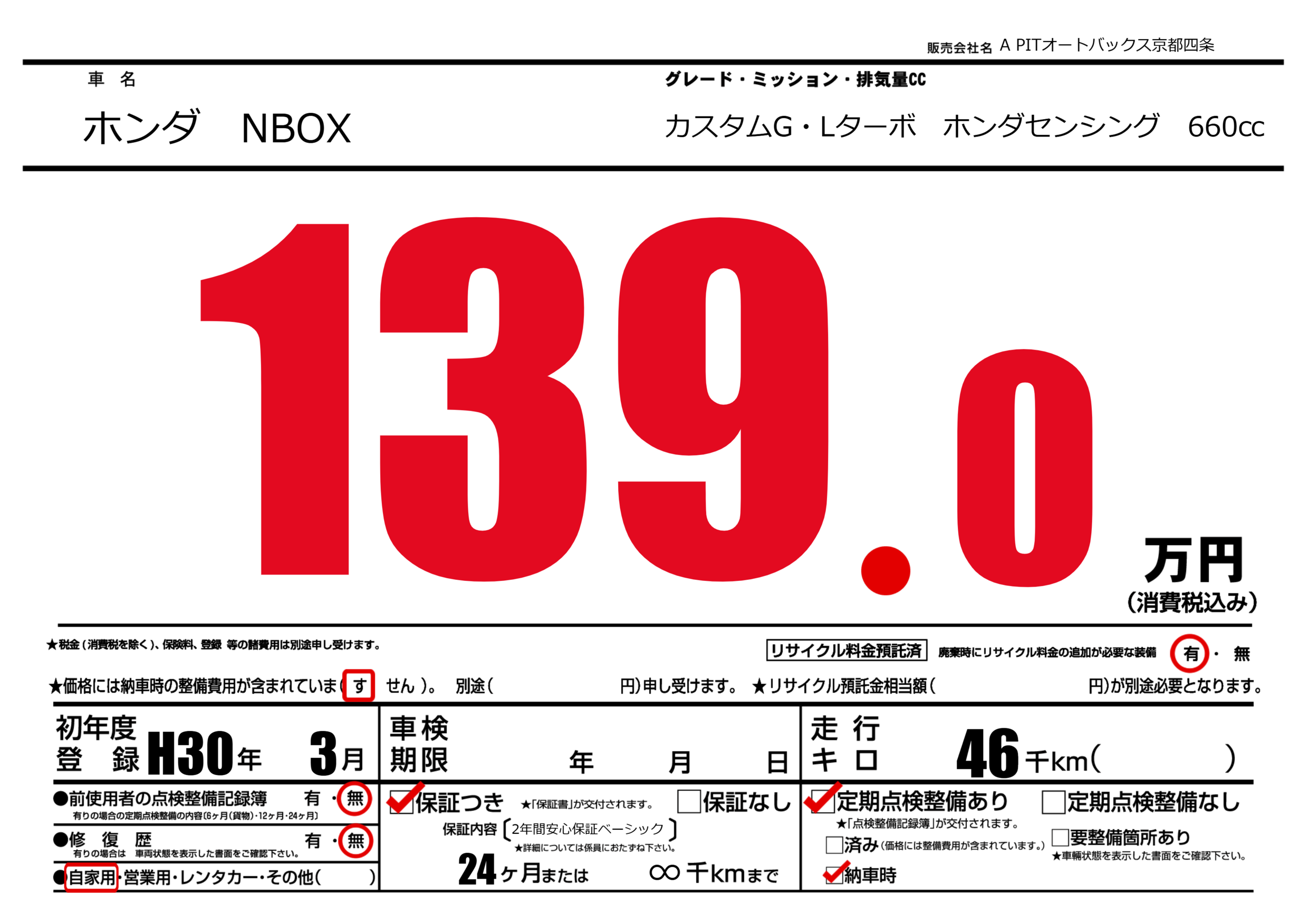 保証なし 保証内容(2年間安心保証ベーシック) 24ヶ月または(∞)千kmまで |