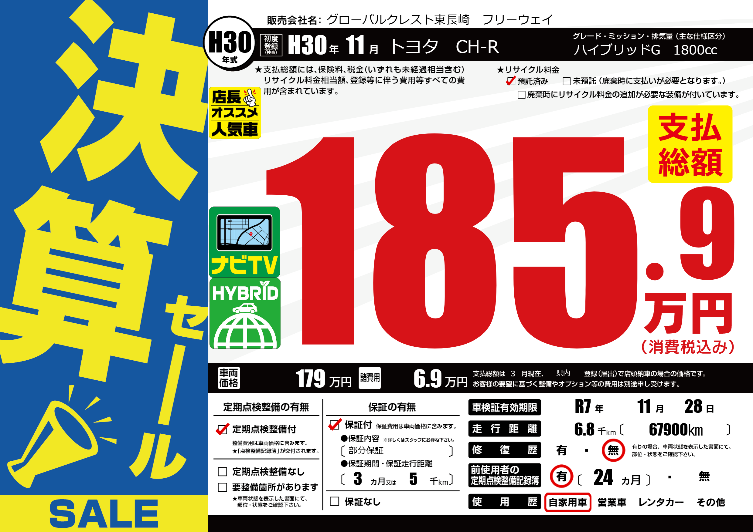 | 走行キロ | 0.6万km | 初年度登録 | H30年11月 |