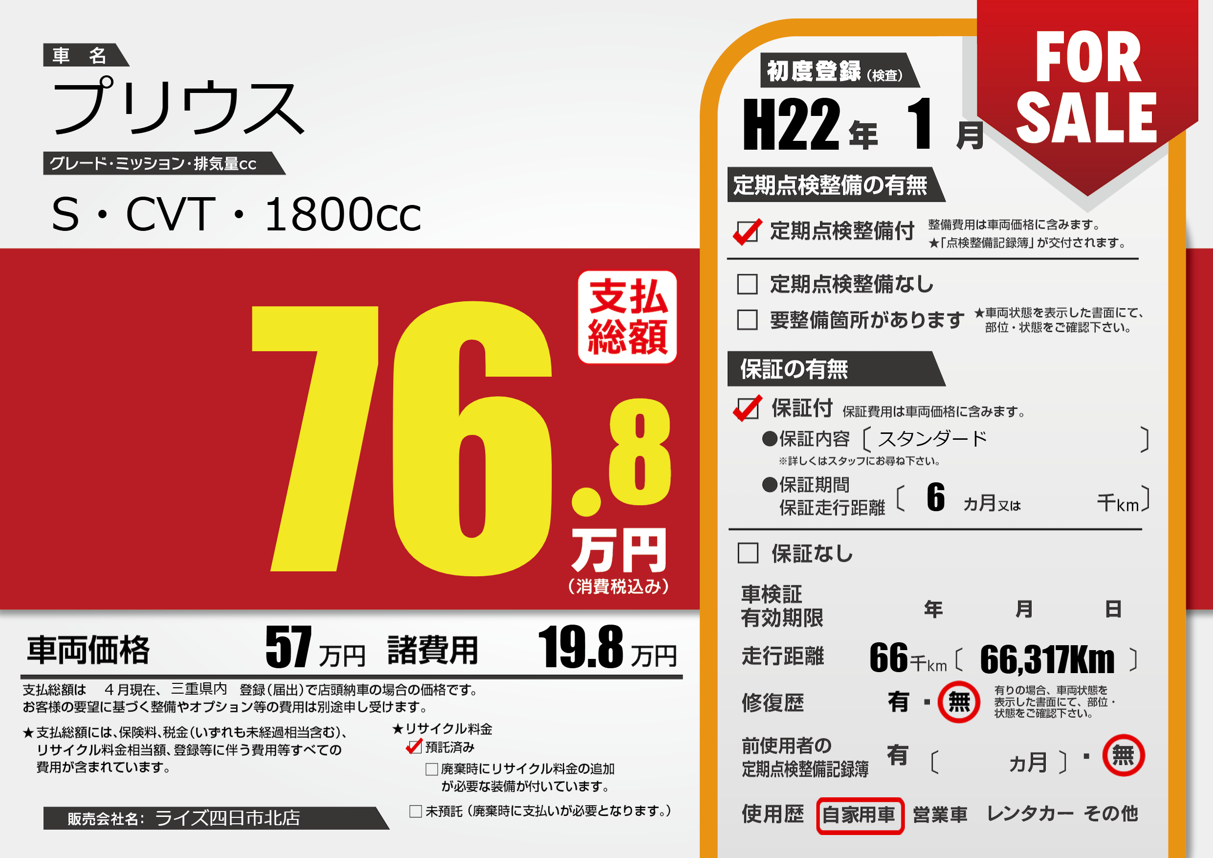 | 車名 | プリウス | グレード ミッション 排気量 |