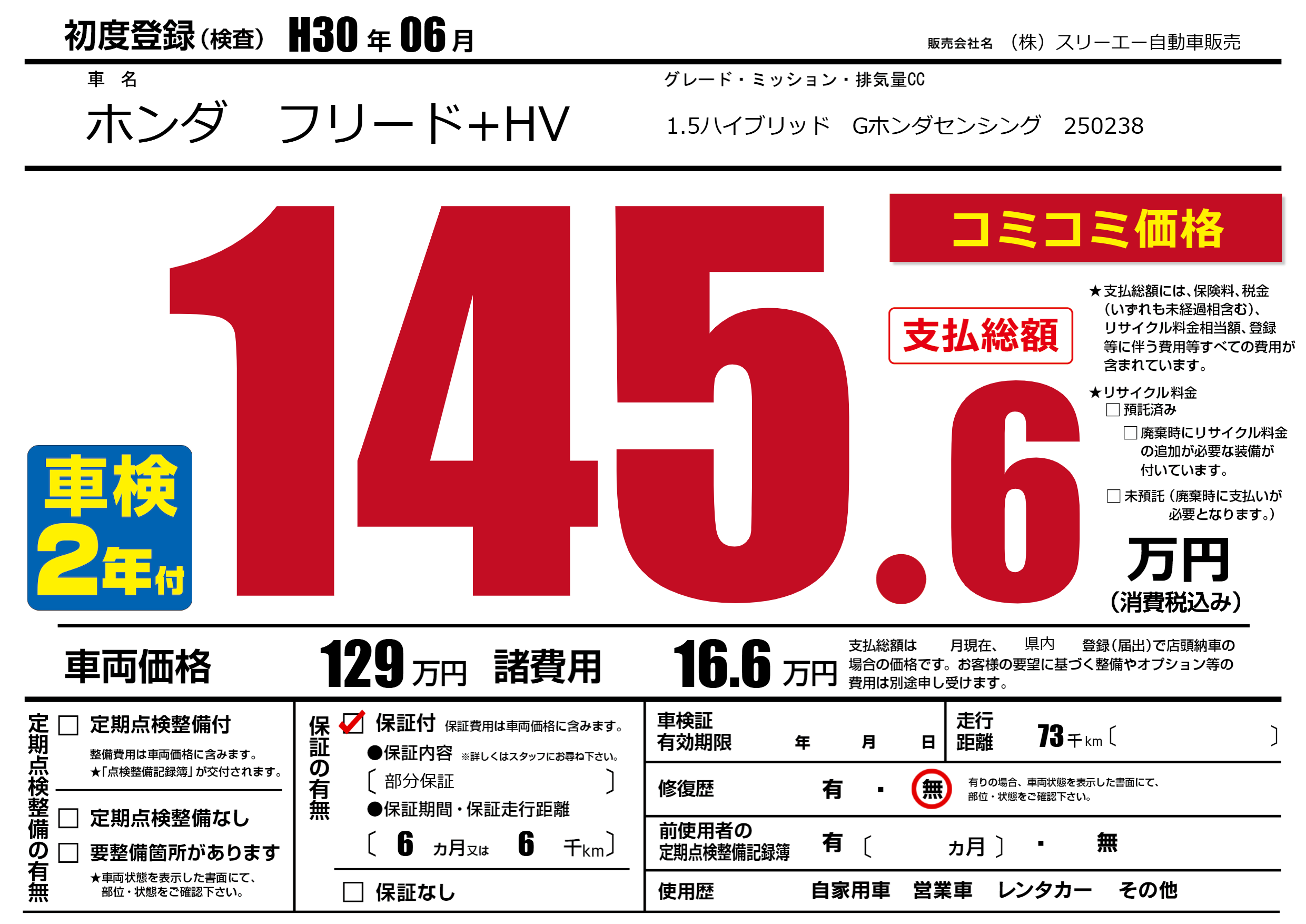 | 走行キロ | 7.3万km | 初年度登録 | H30年06月 |