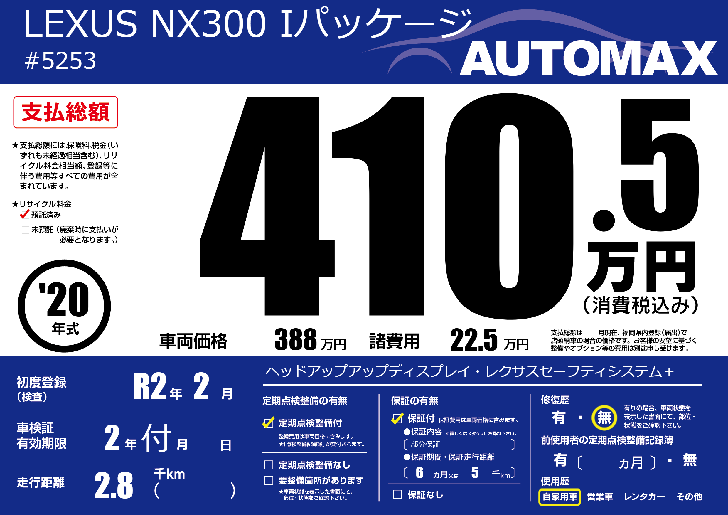| 車名 | LEXUS NX300 Iパッケージ | グレード ミッション 排気量 |