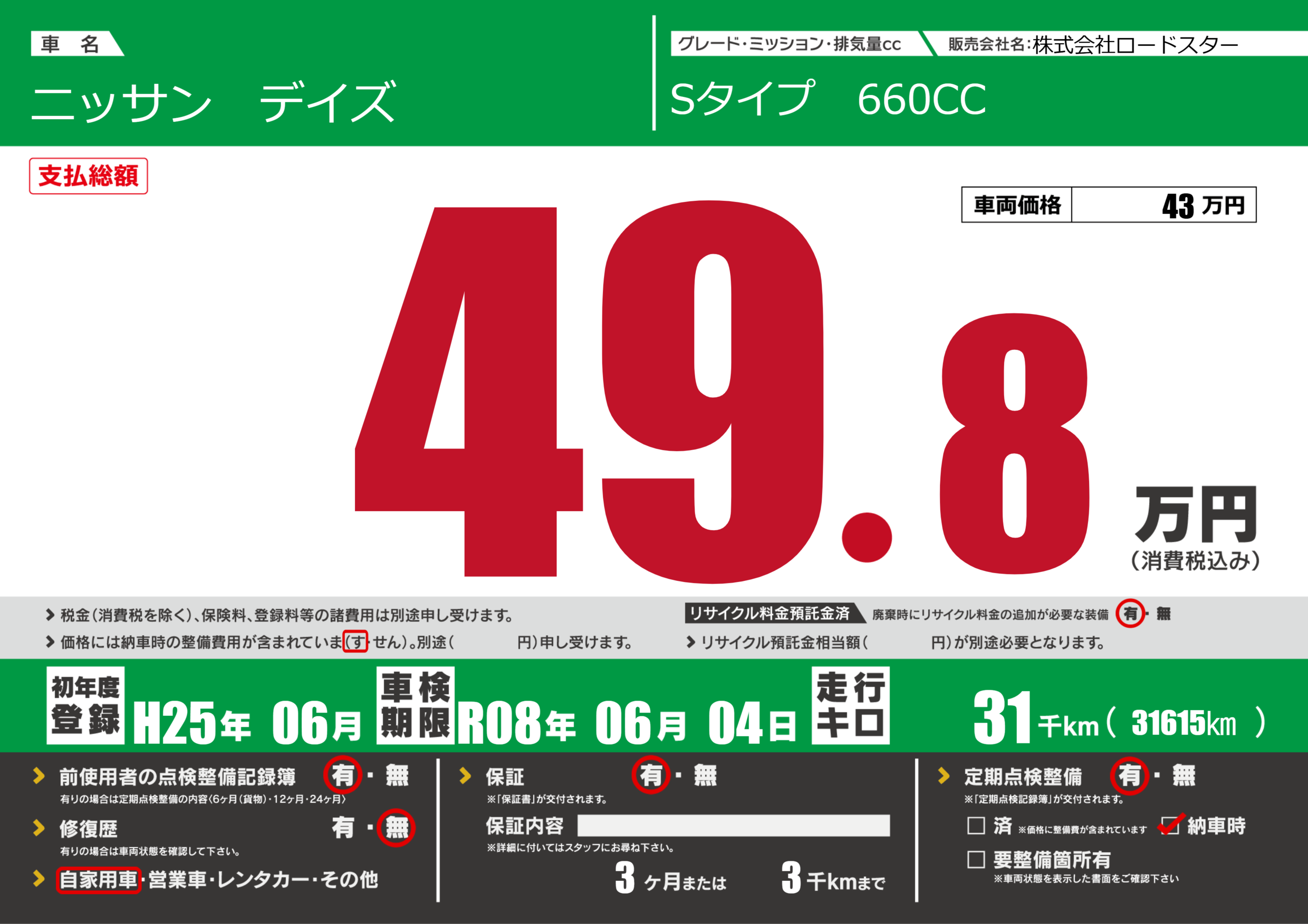 | 定期点検整備 | 定期点検整備あり 納車時あり | ||