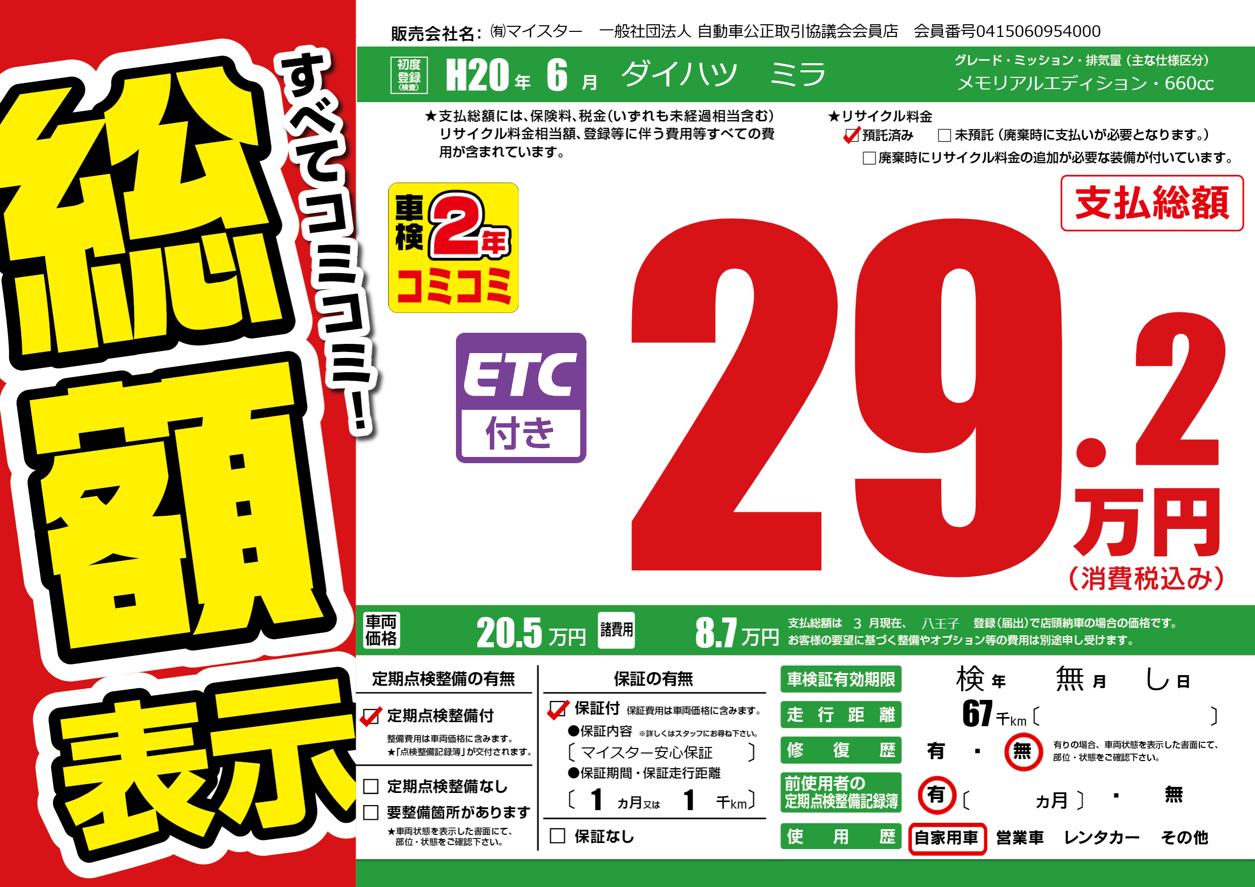 | 走行キロ | 6.7万km | 初年度登録 | H20年6月 |