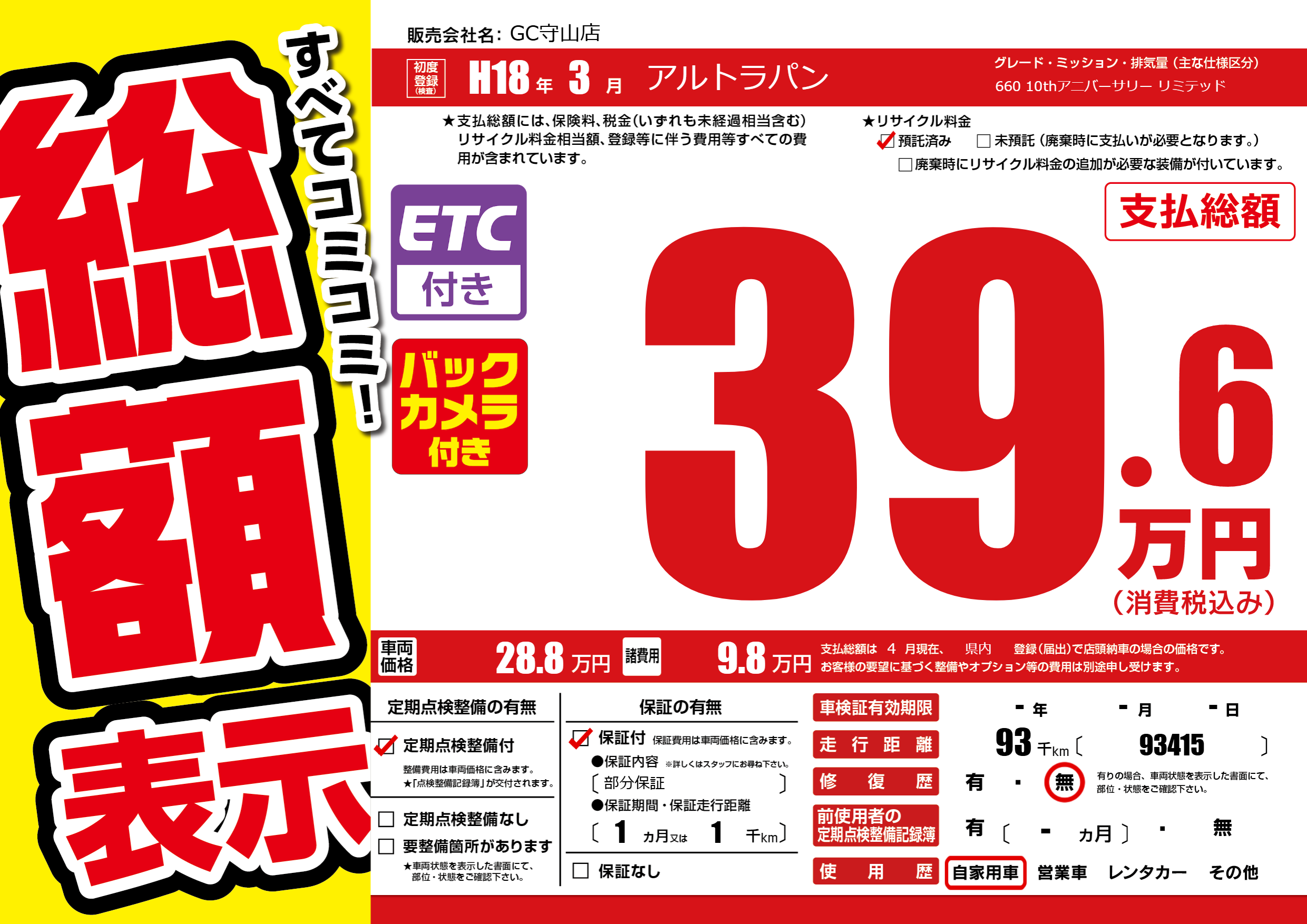 | 走行キロ | 9.3万km | 初年度登録 | H18年3月 |