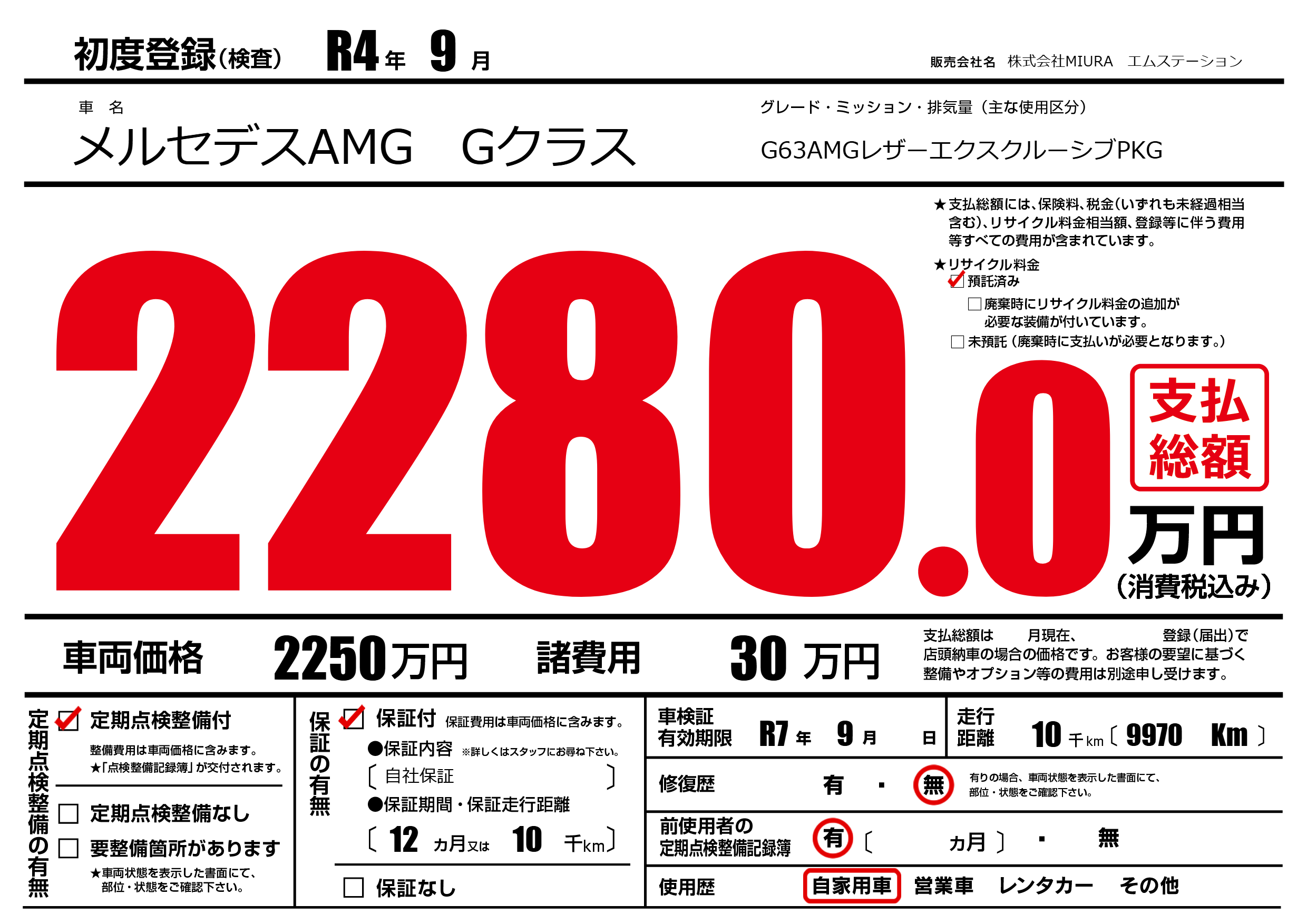 | 車名 | メルセデスAMG Gクラス | グレード ミッション 排気量 |