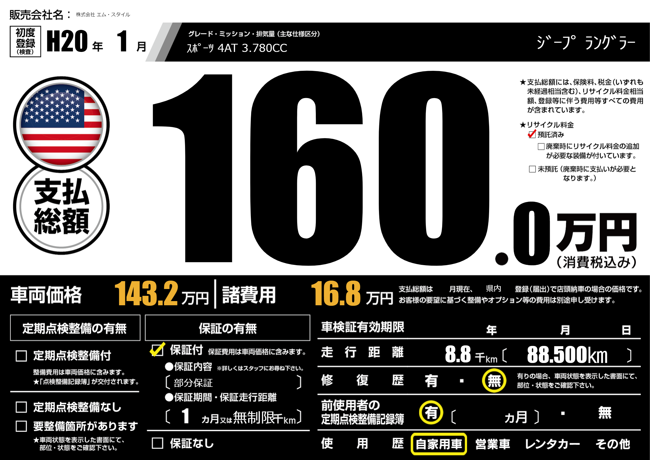 | 車名 | ジープ ラングラー | グレード ミッション 排気量 |