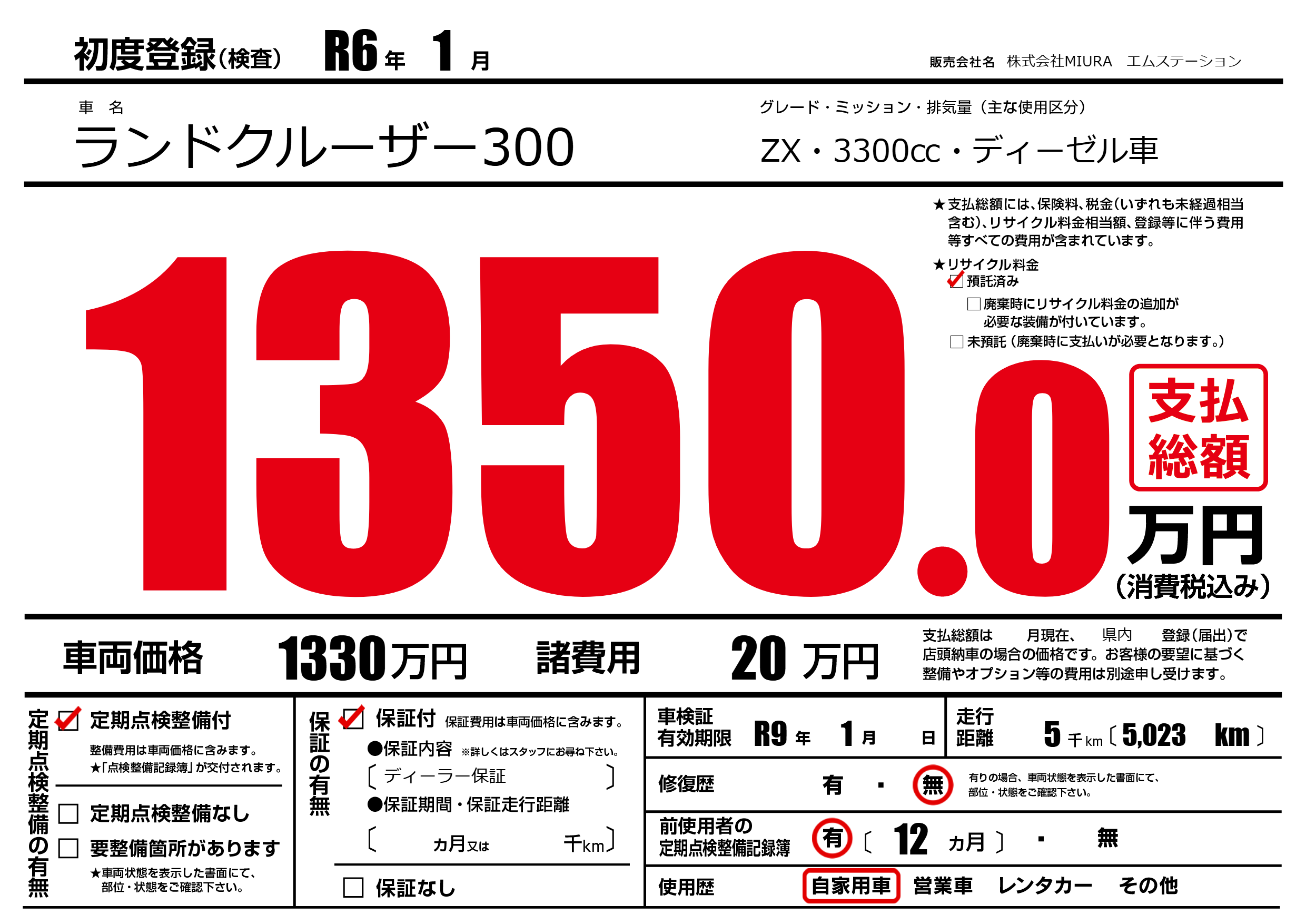 | 車名 | ランドクルーザー300 | グレード ミッション 排気量 |