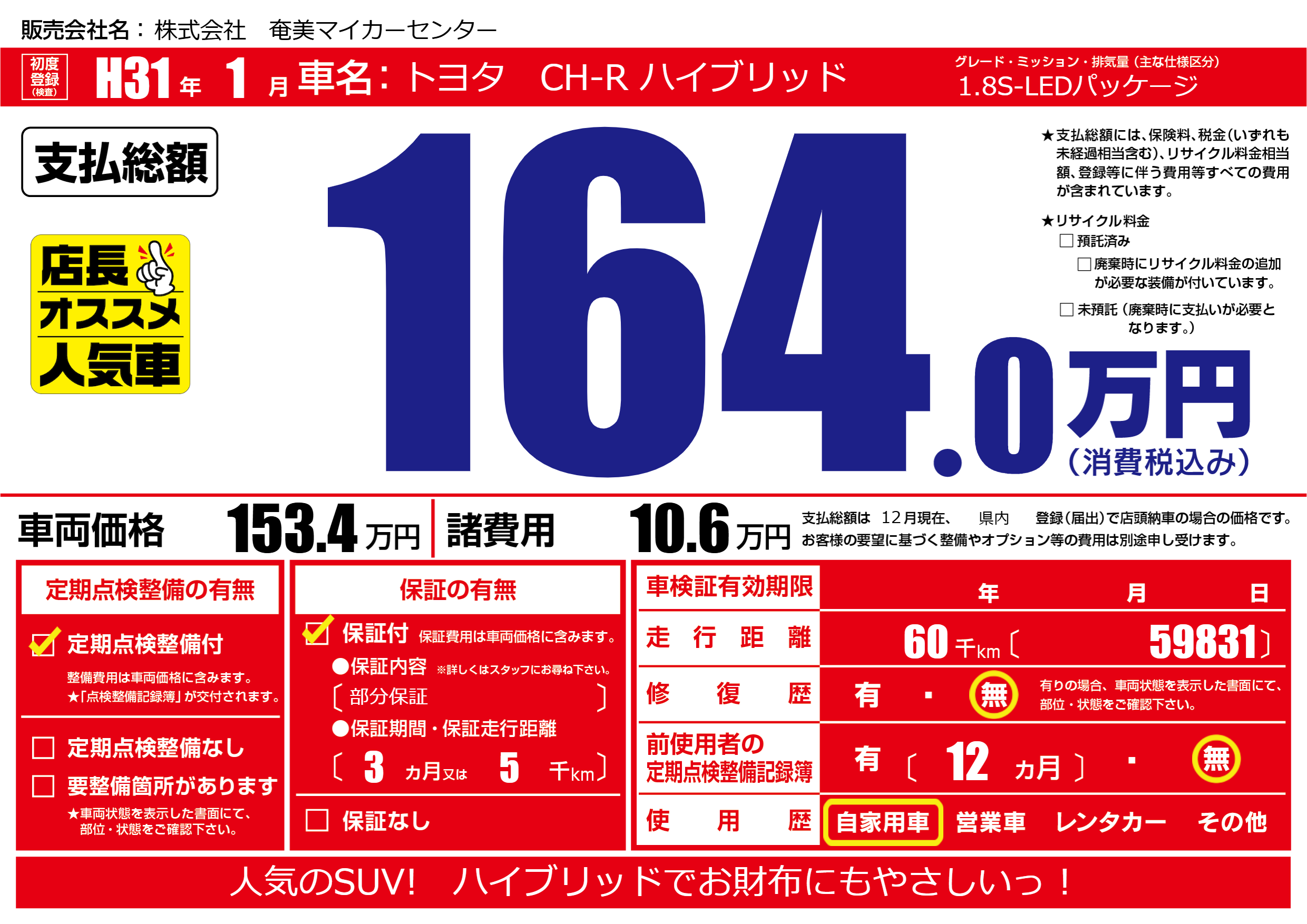 | 車名 | トヨタ CH-R ハイブリッド | グレード ミッション 排気量 |