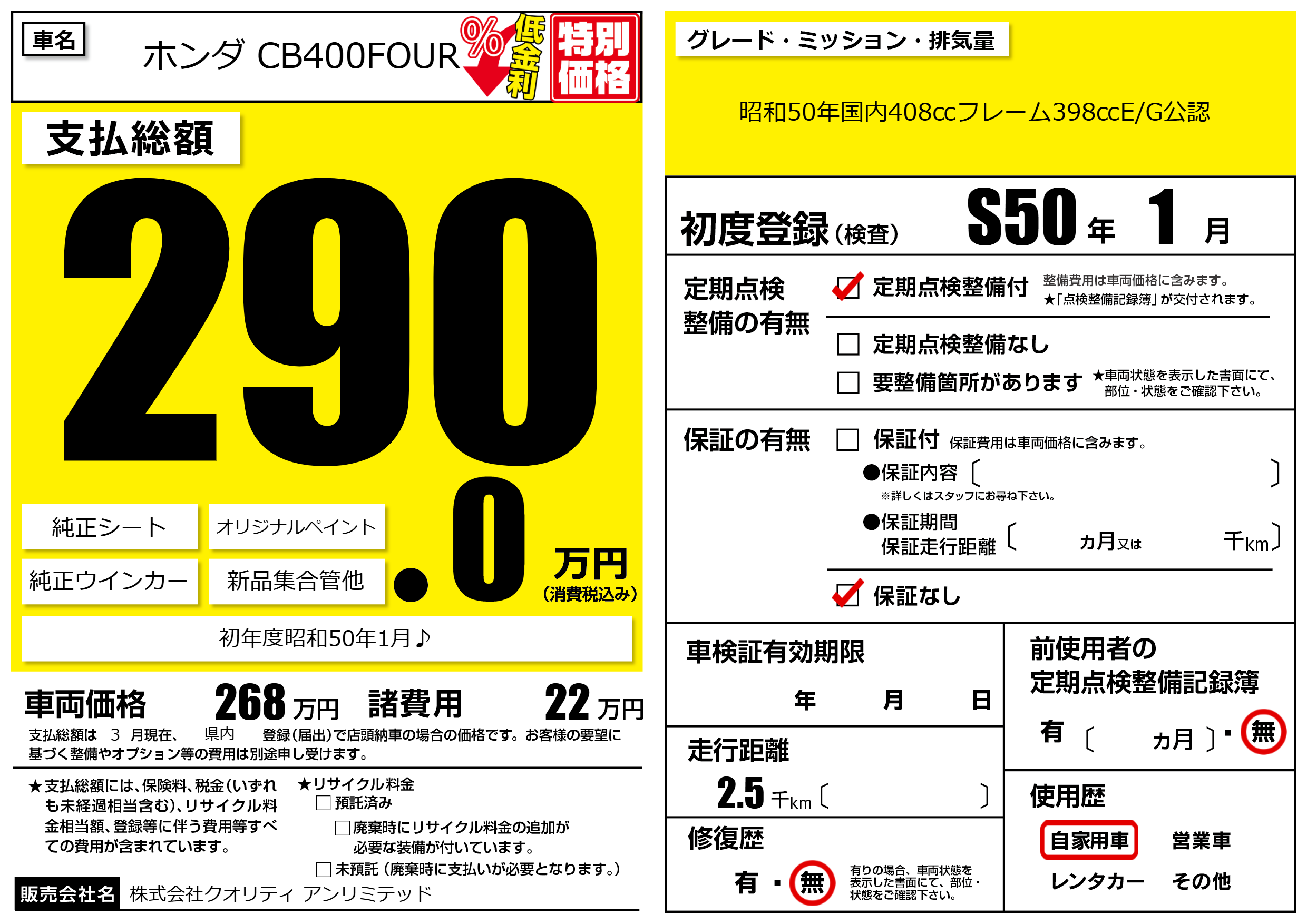 | 車名 | ホンダ CB400FOUR | グレード ミッション 排気量 |